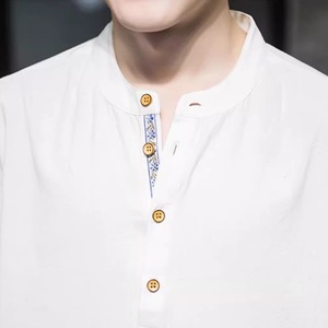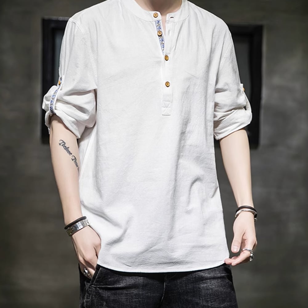落ち着いた印象のヘンリーネックデザインがおしゃれな七分袖トップス。