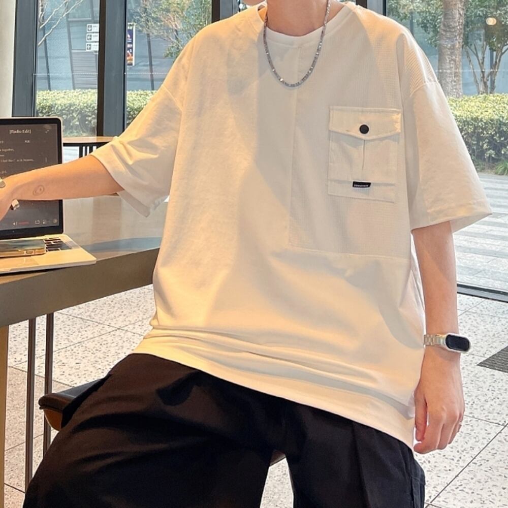 異素材が合わさったフラップポケットTシャツ。
