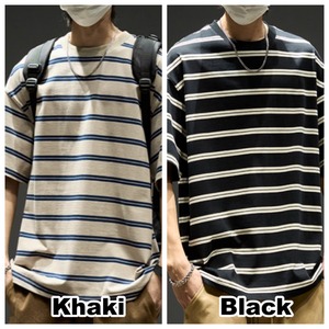 カジュアルでリラックスした雰囲気が魅力のラウンドネックボーダーTシャツ。
