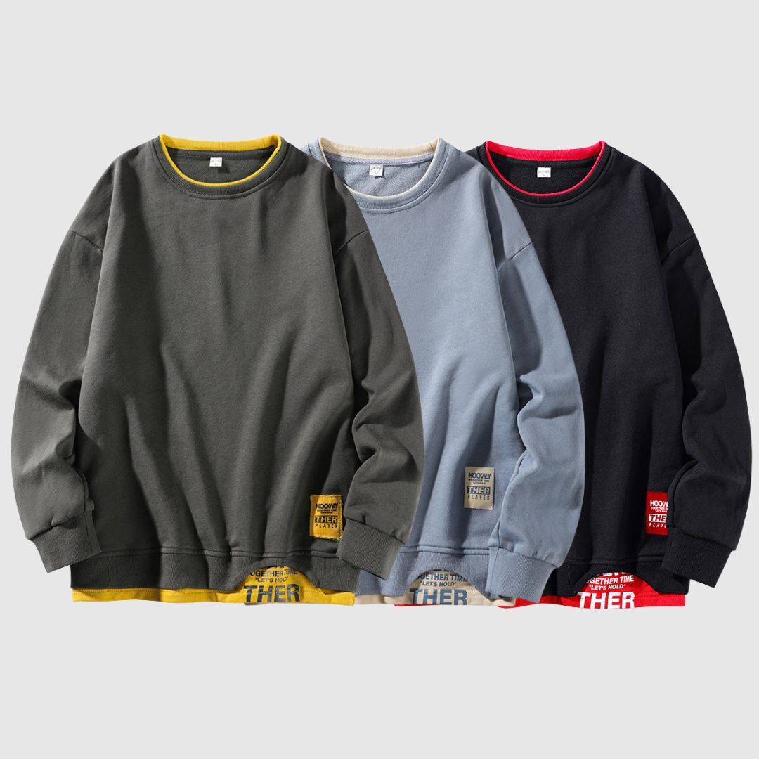 重ね着風デザインが魅力の、フェイクレイヤードスウェットシャツ。