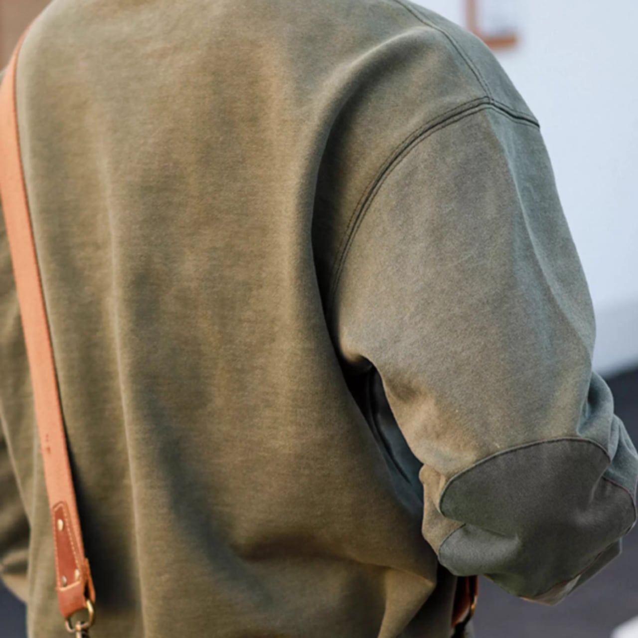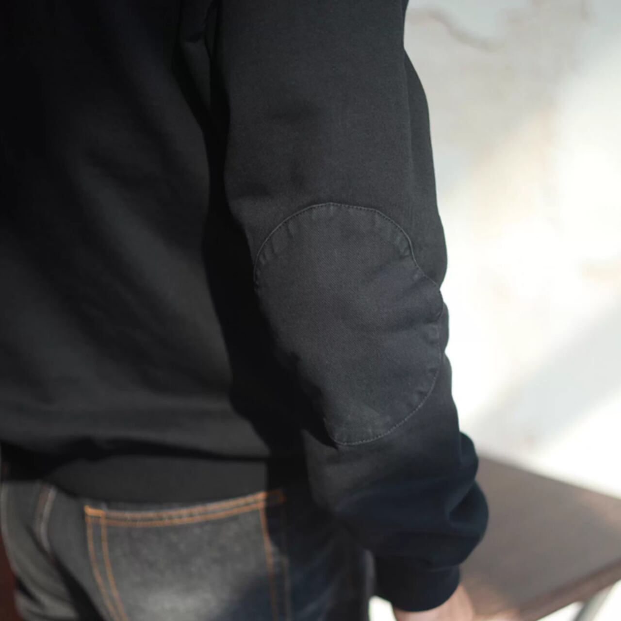 肘あてデザインが施されており、カジュアルでありながらも独特なスタイルを演出します。