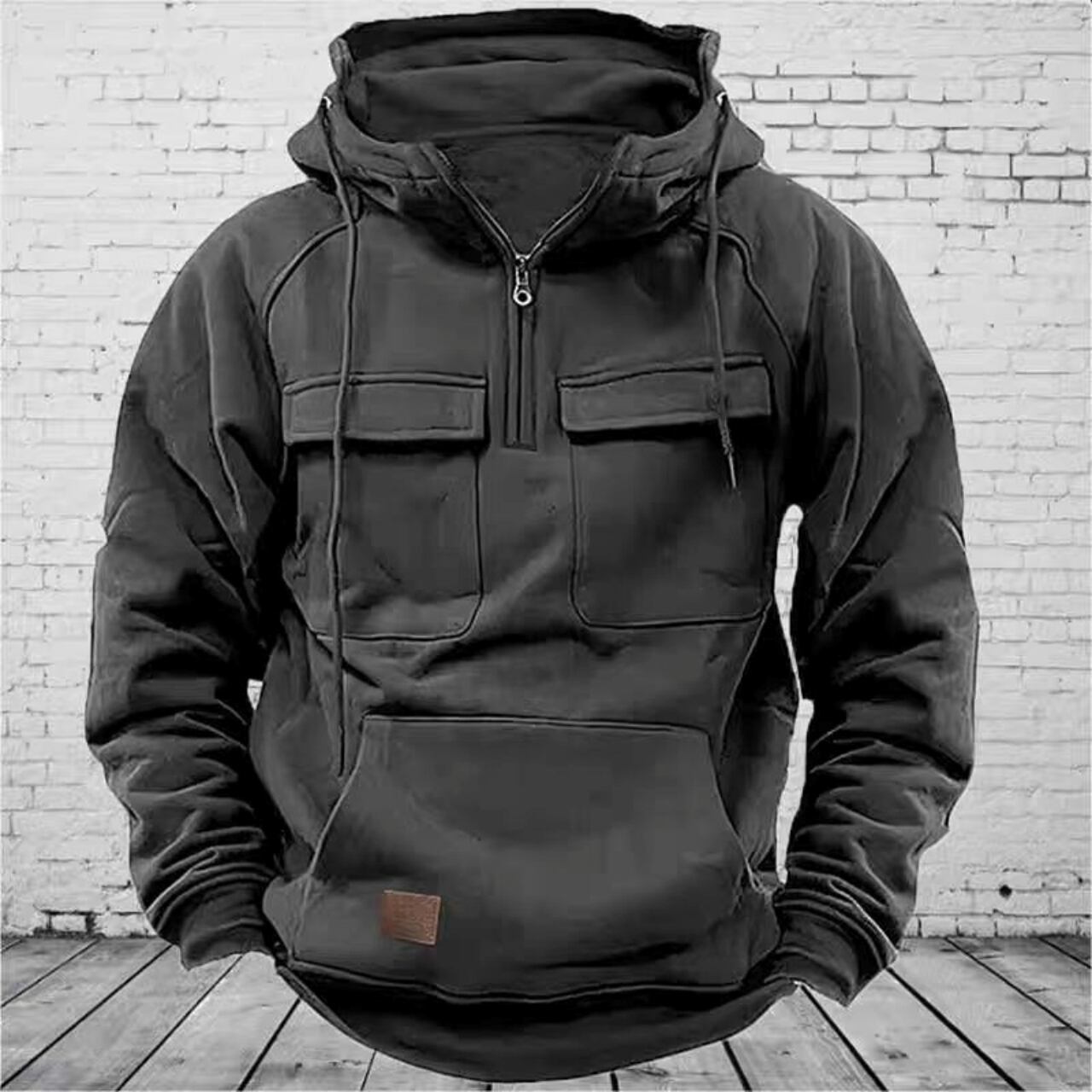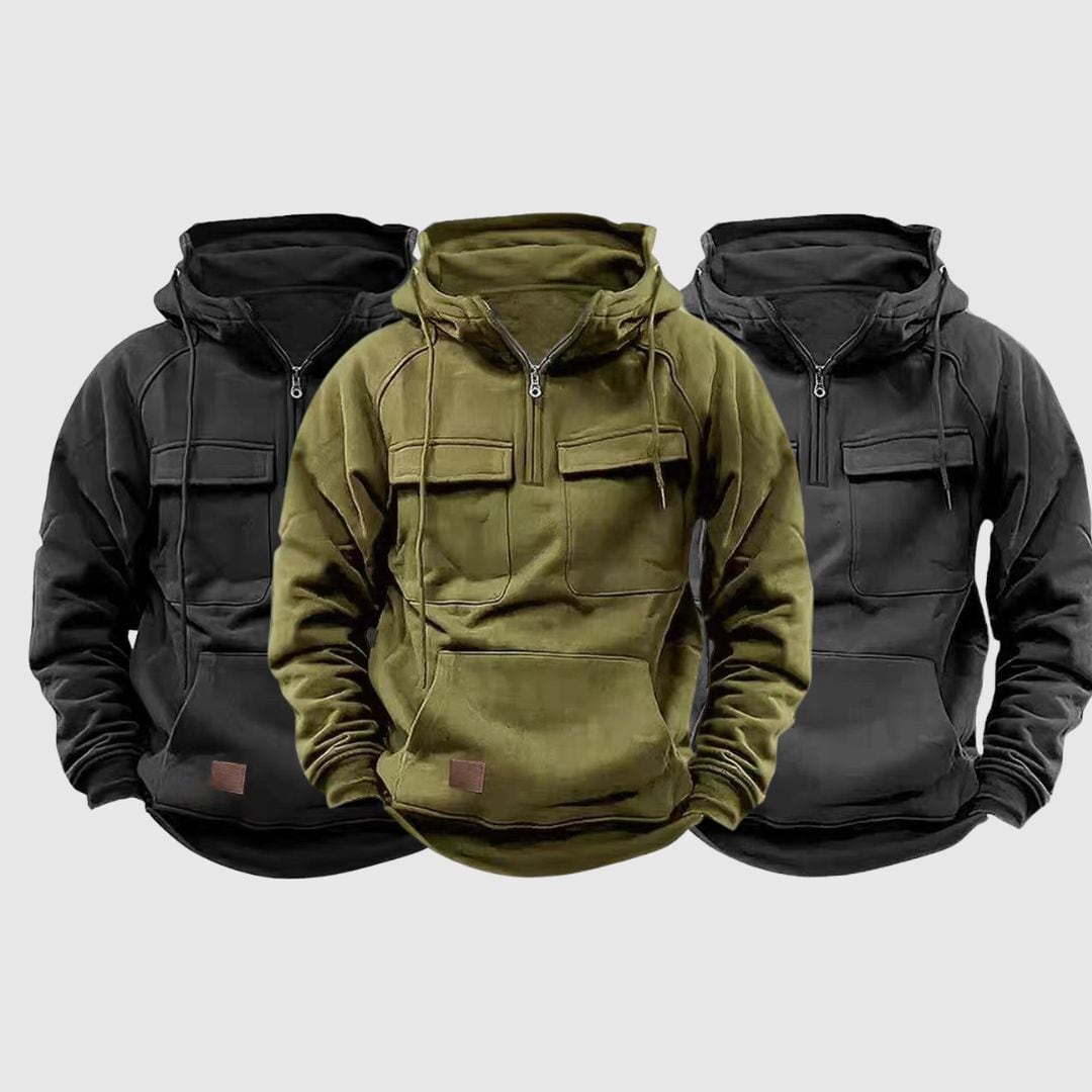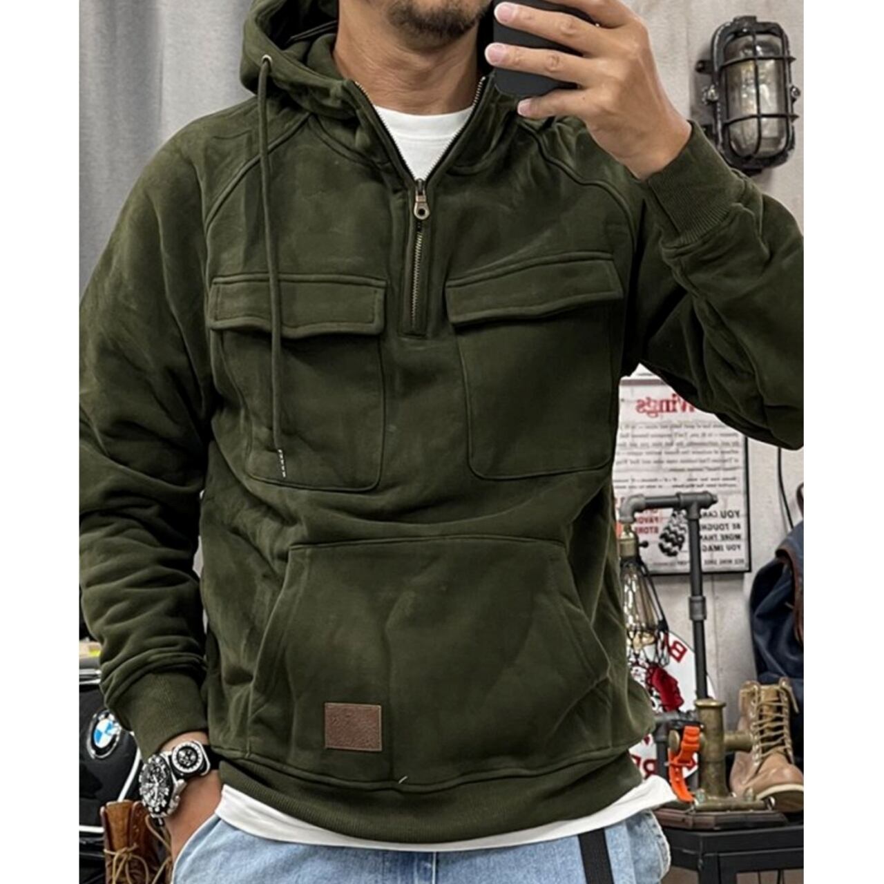 カジュアルさとユニークさを兼ね備えたハーフジップフーディー。
