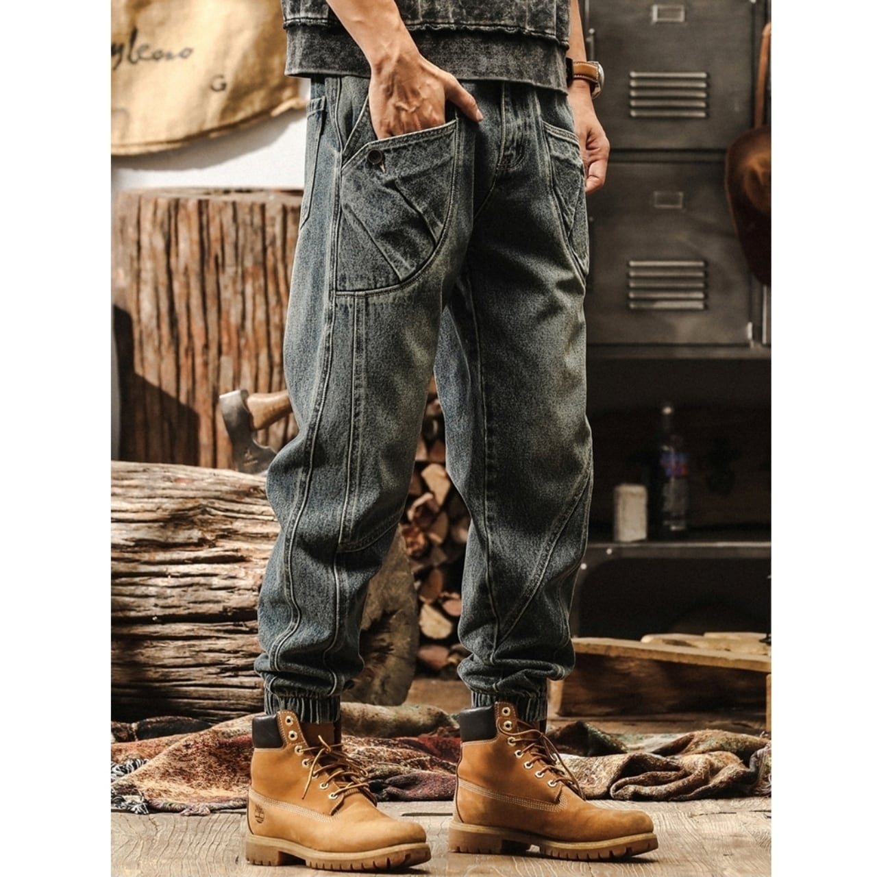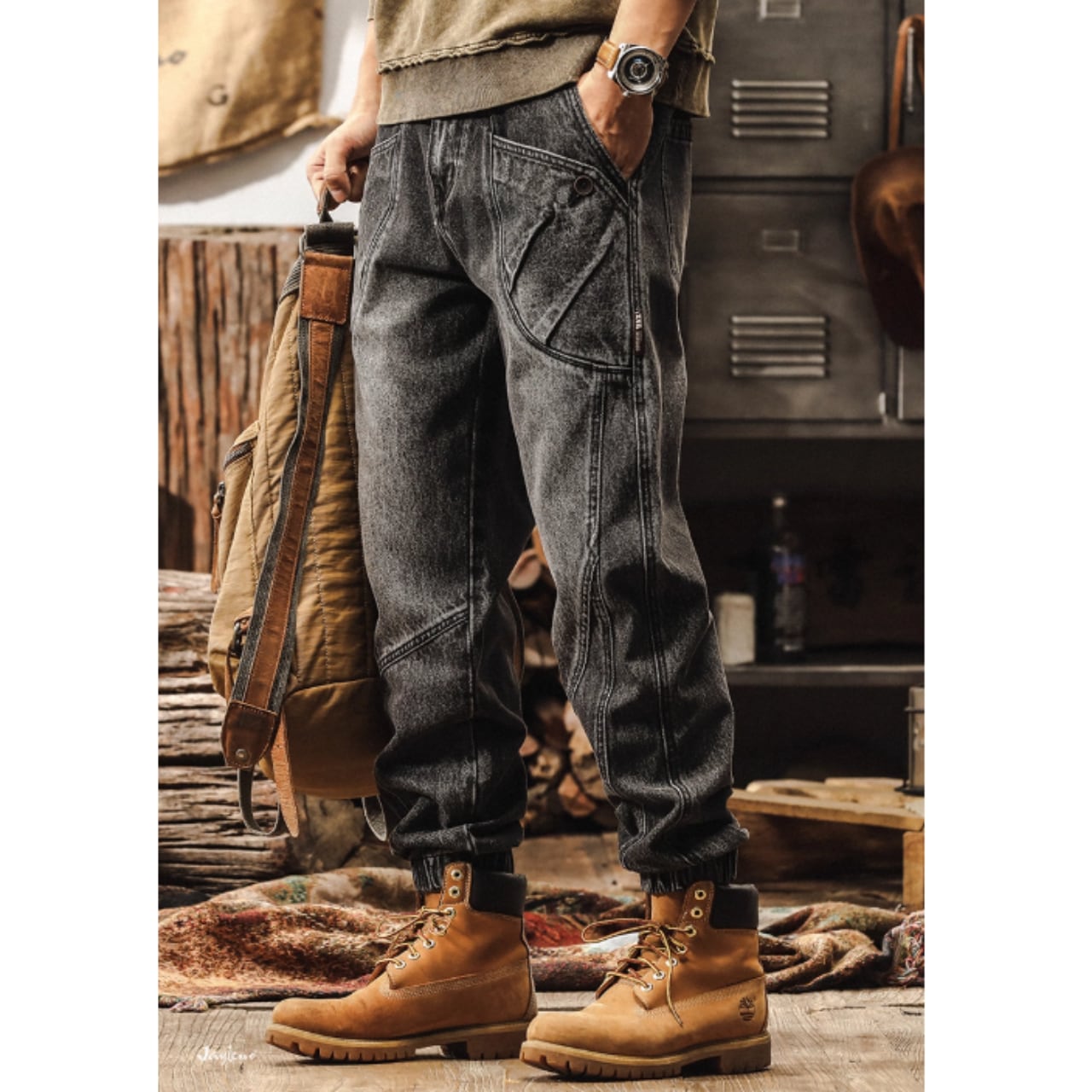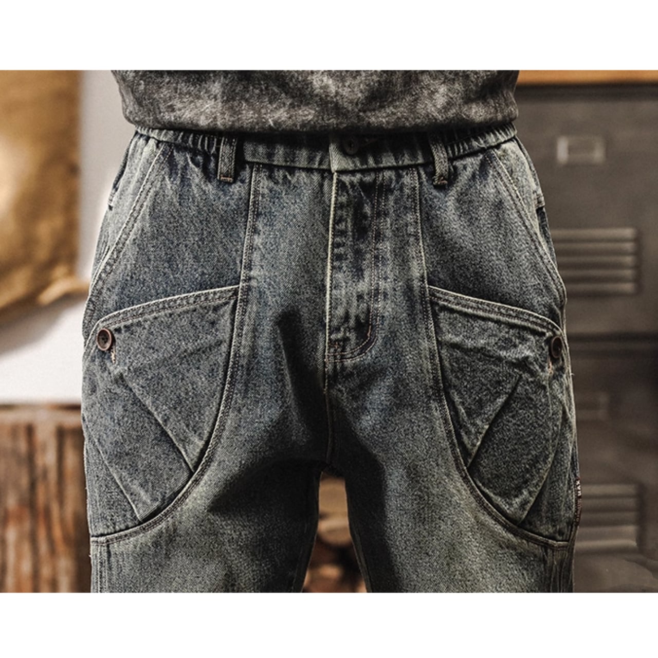 ヴィンテージ感のあるデニム生地の多機能ショルダーバッグ。