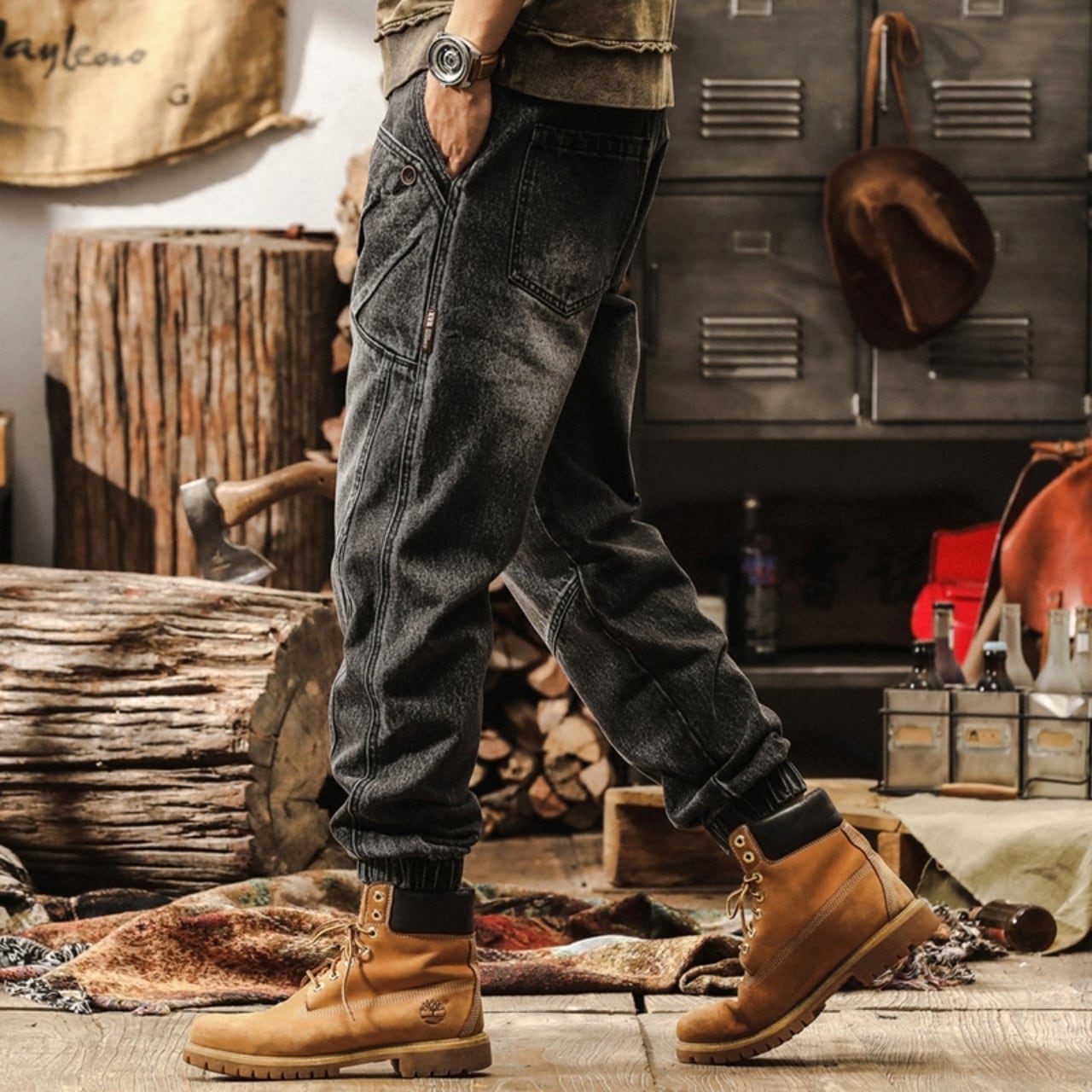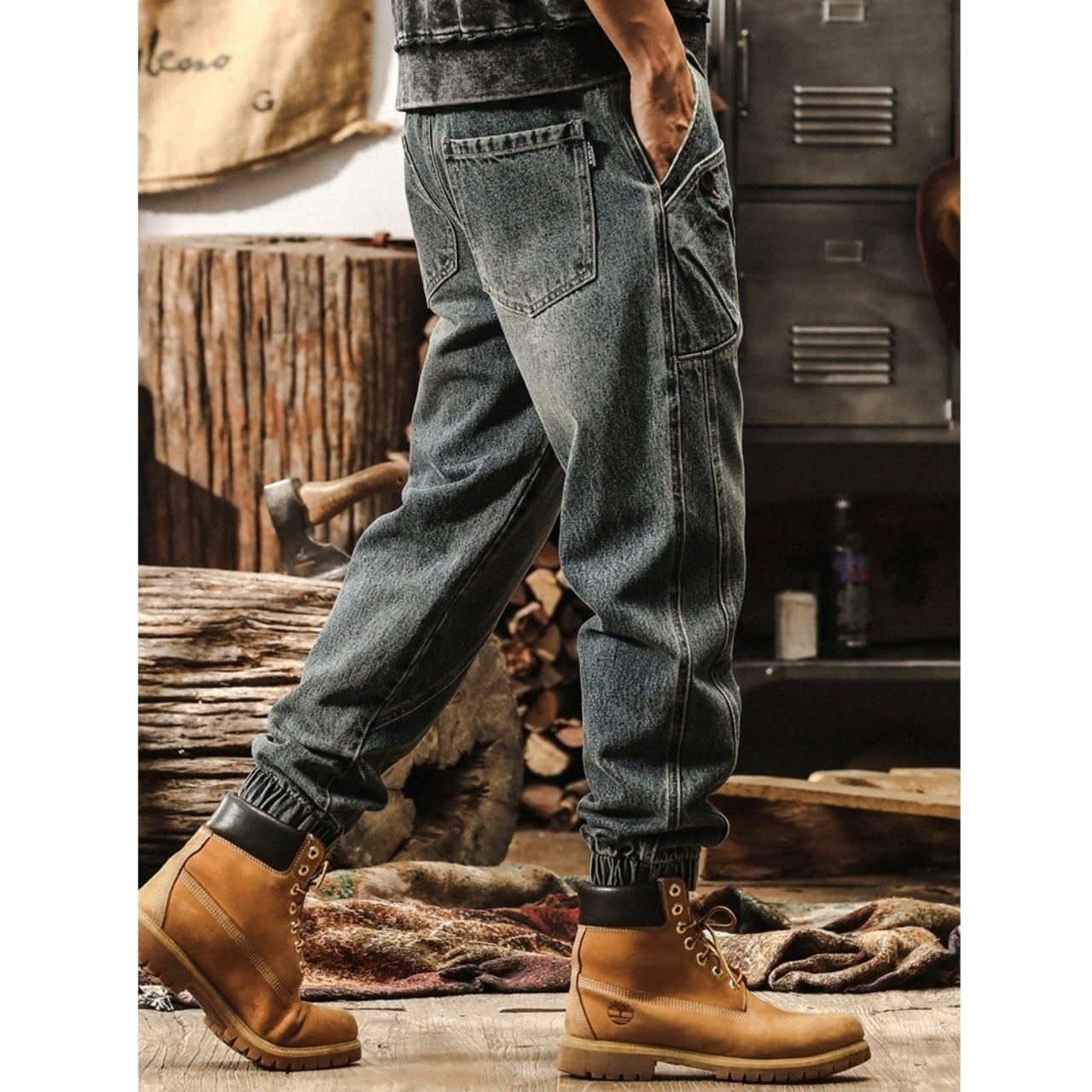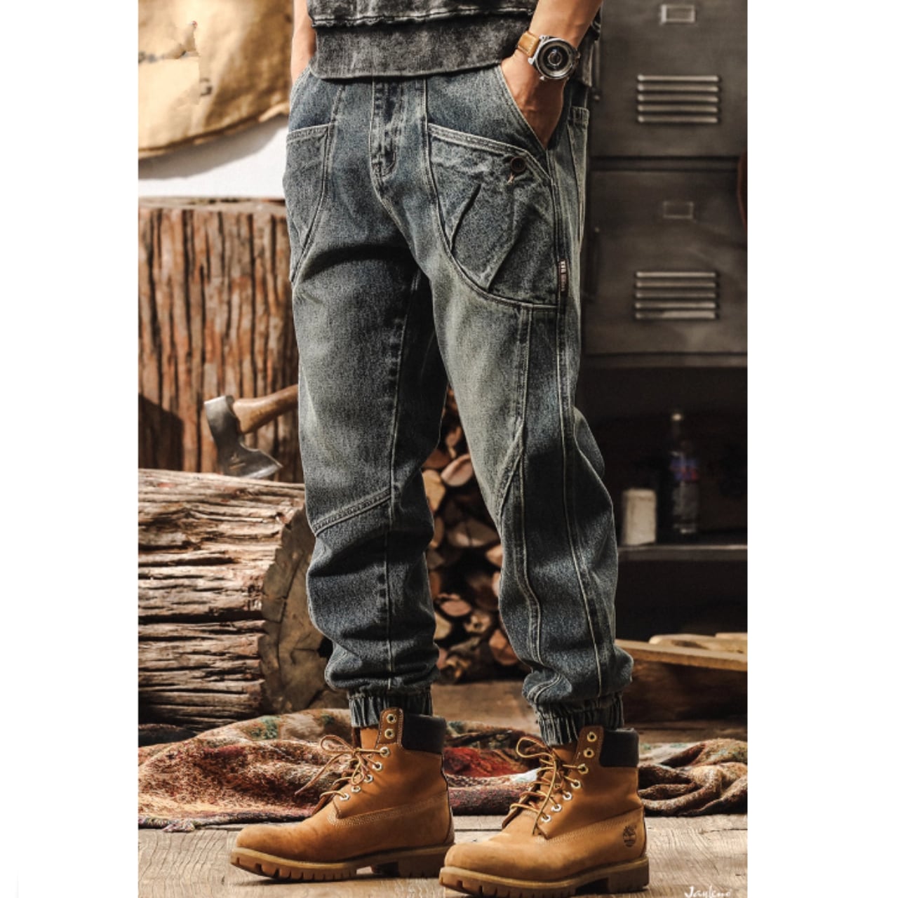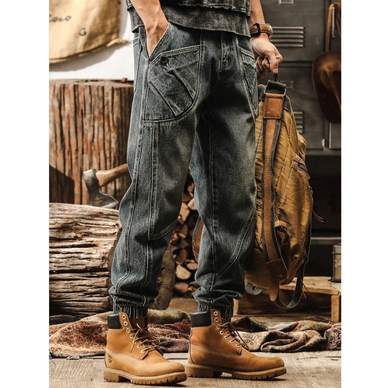 ヴィンテージ感のあるデニム生地の多機能ショルダーバッグ。