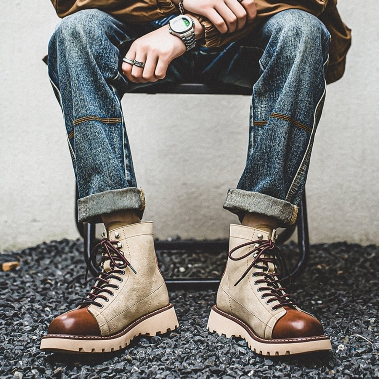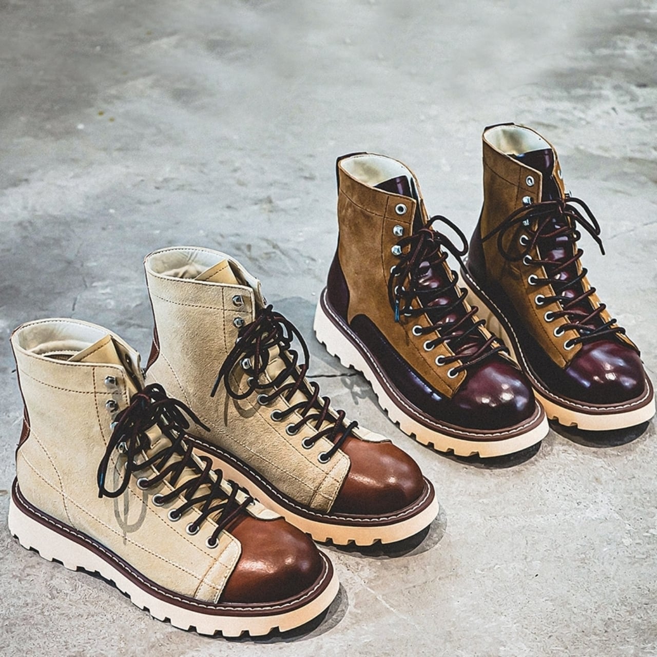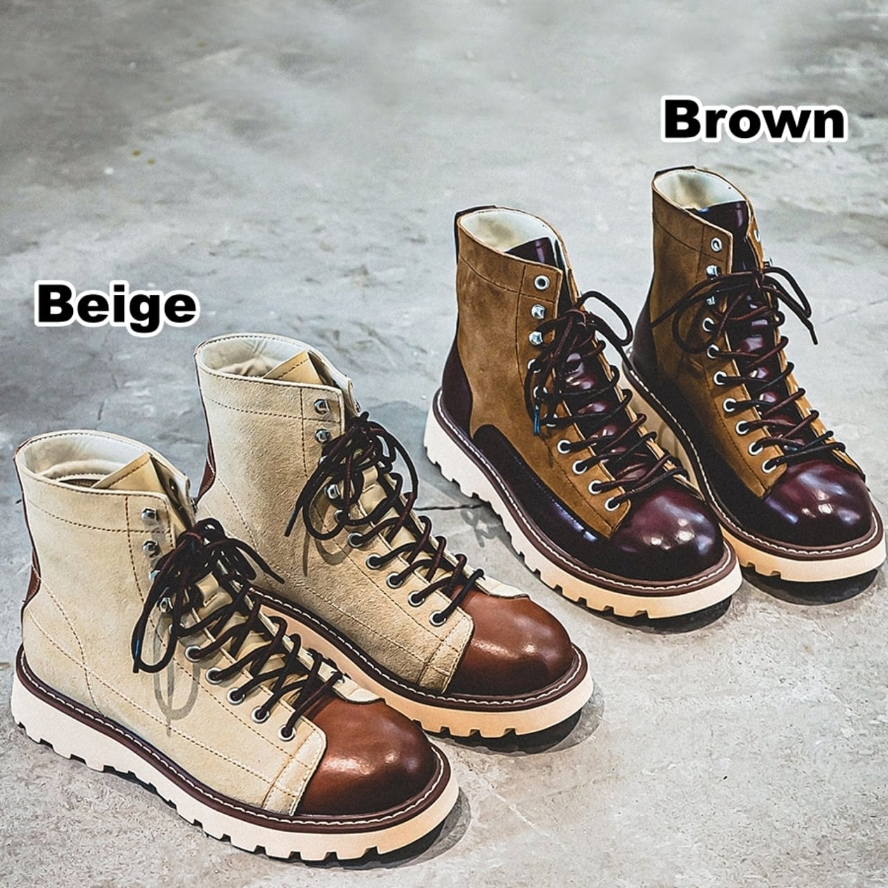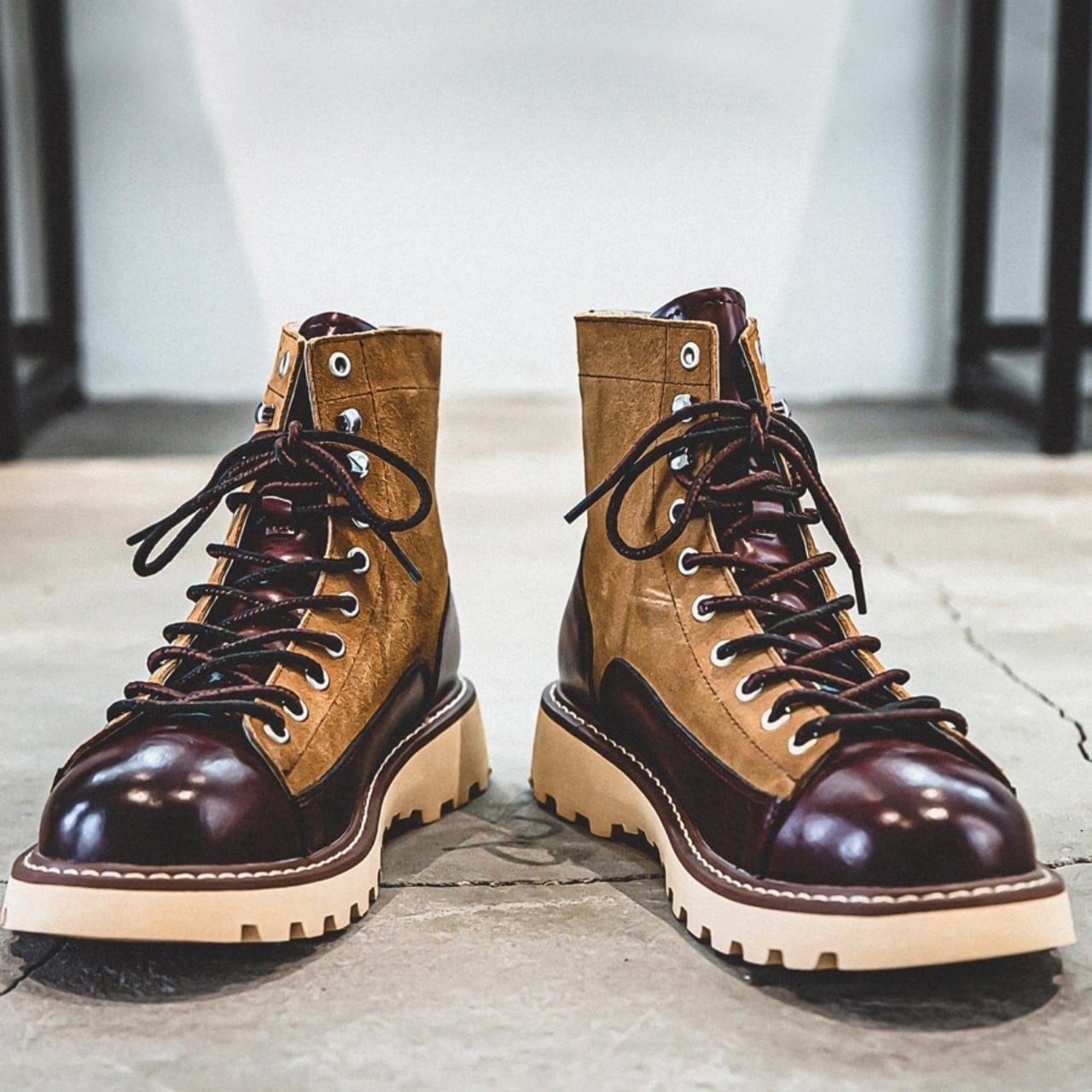 レトロでおしゃれなバイカラーのレザーブーツ。