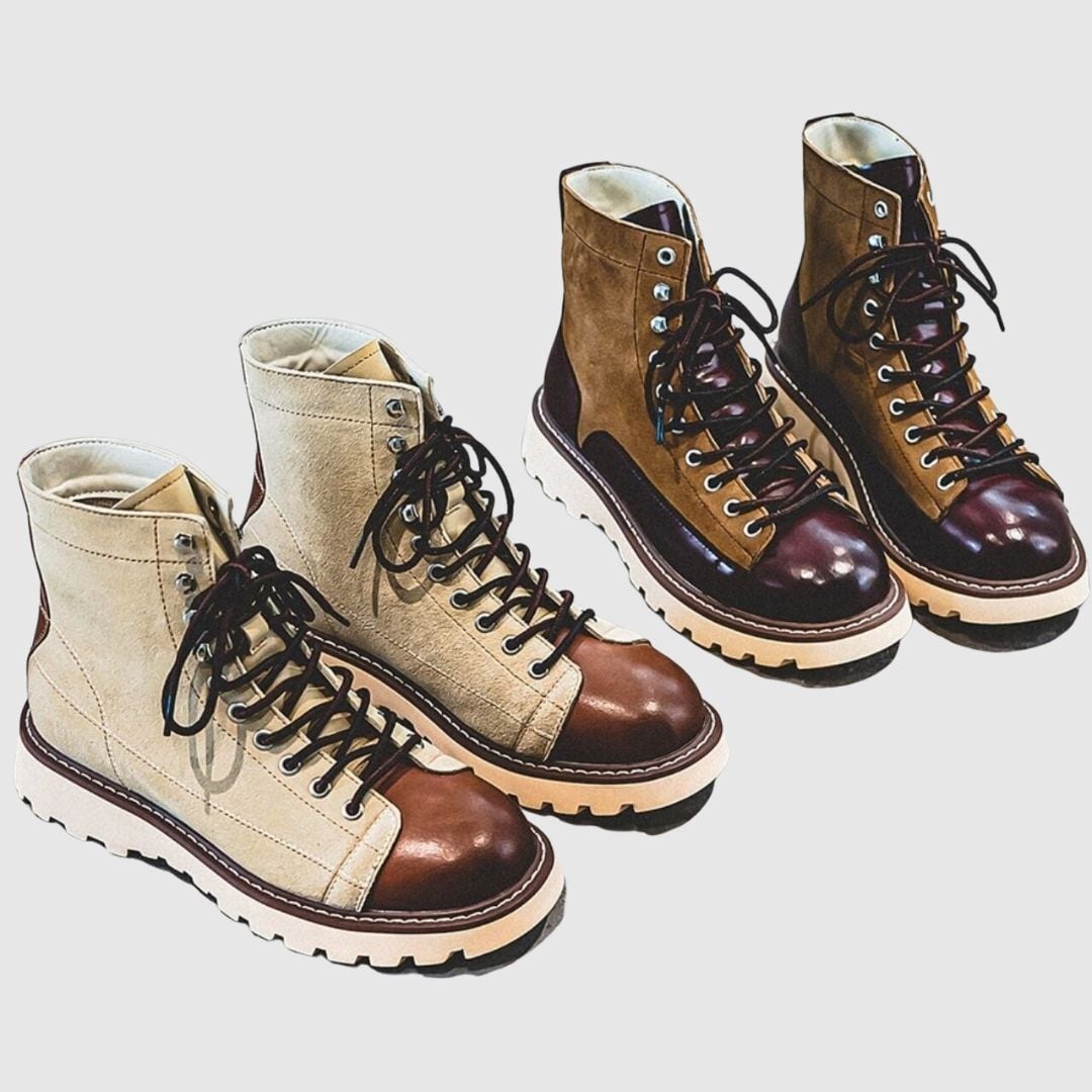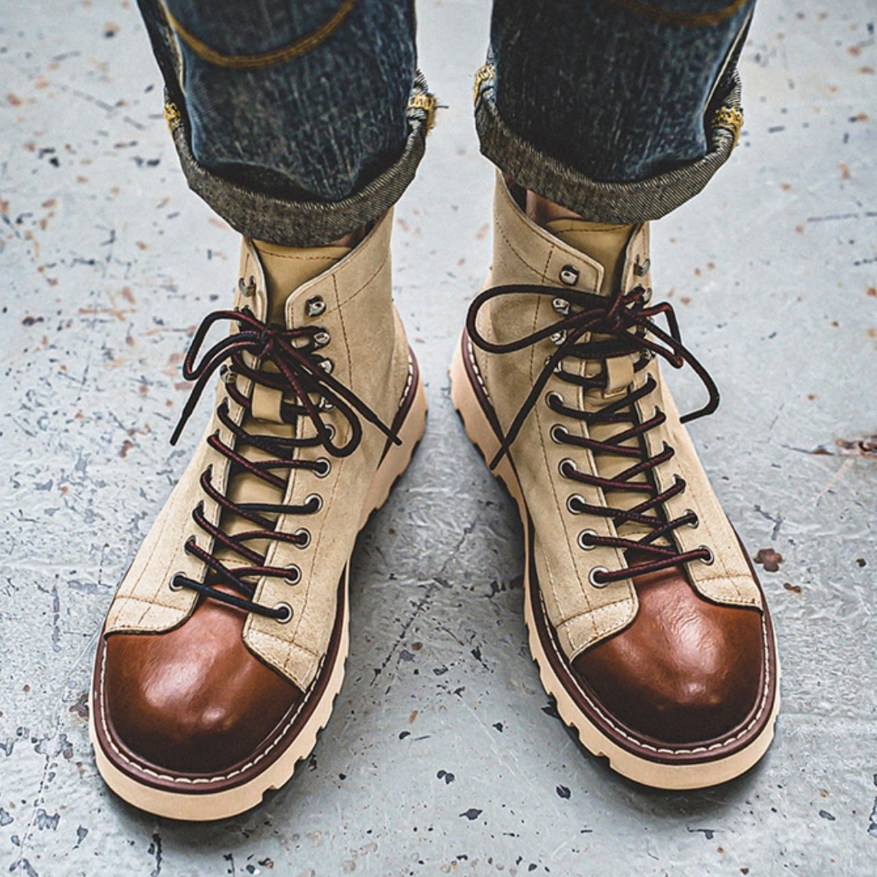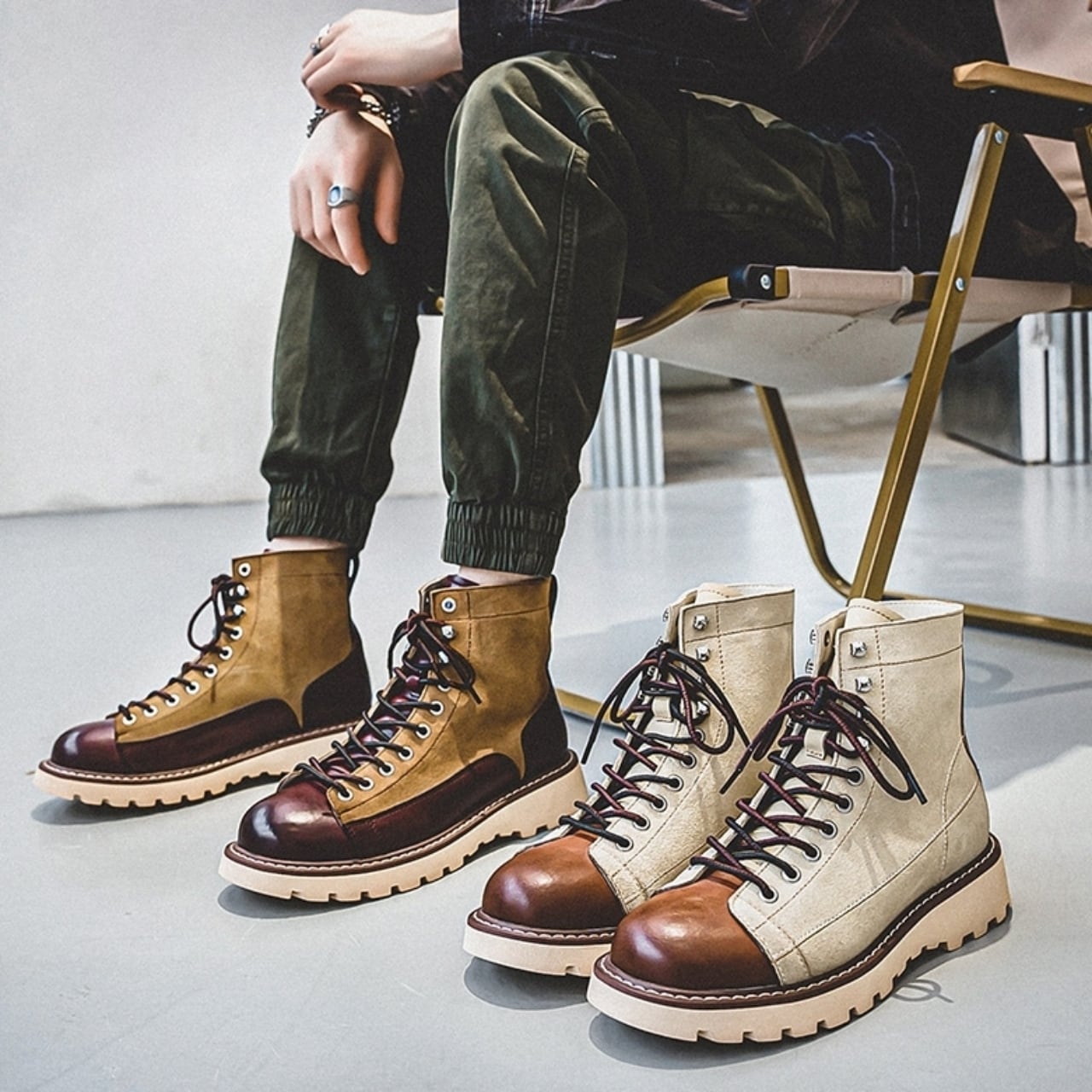 レトロでおしゃれなバイカラーのレザーブーツ。