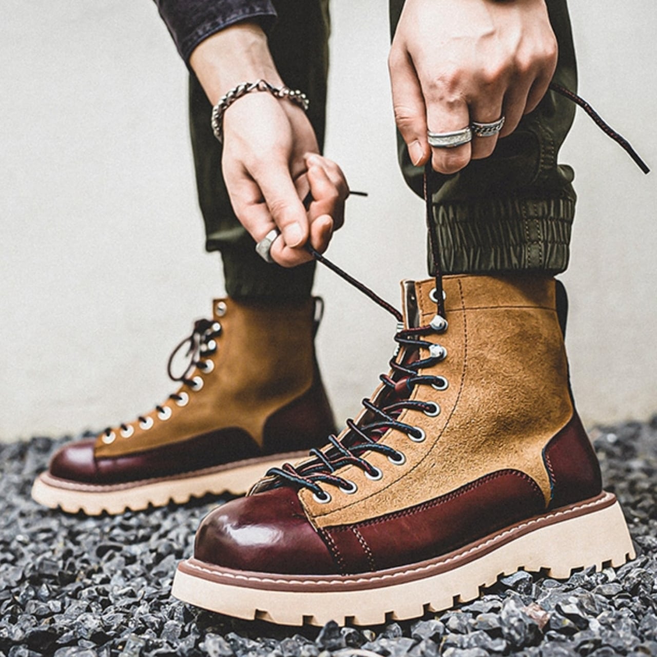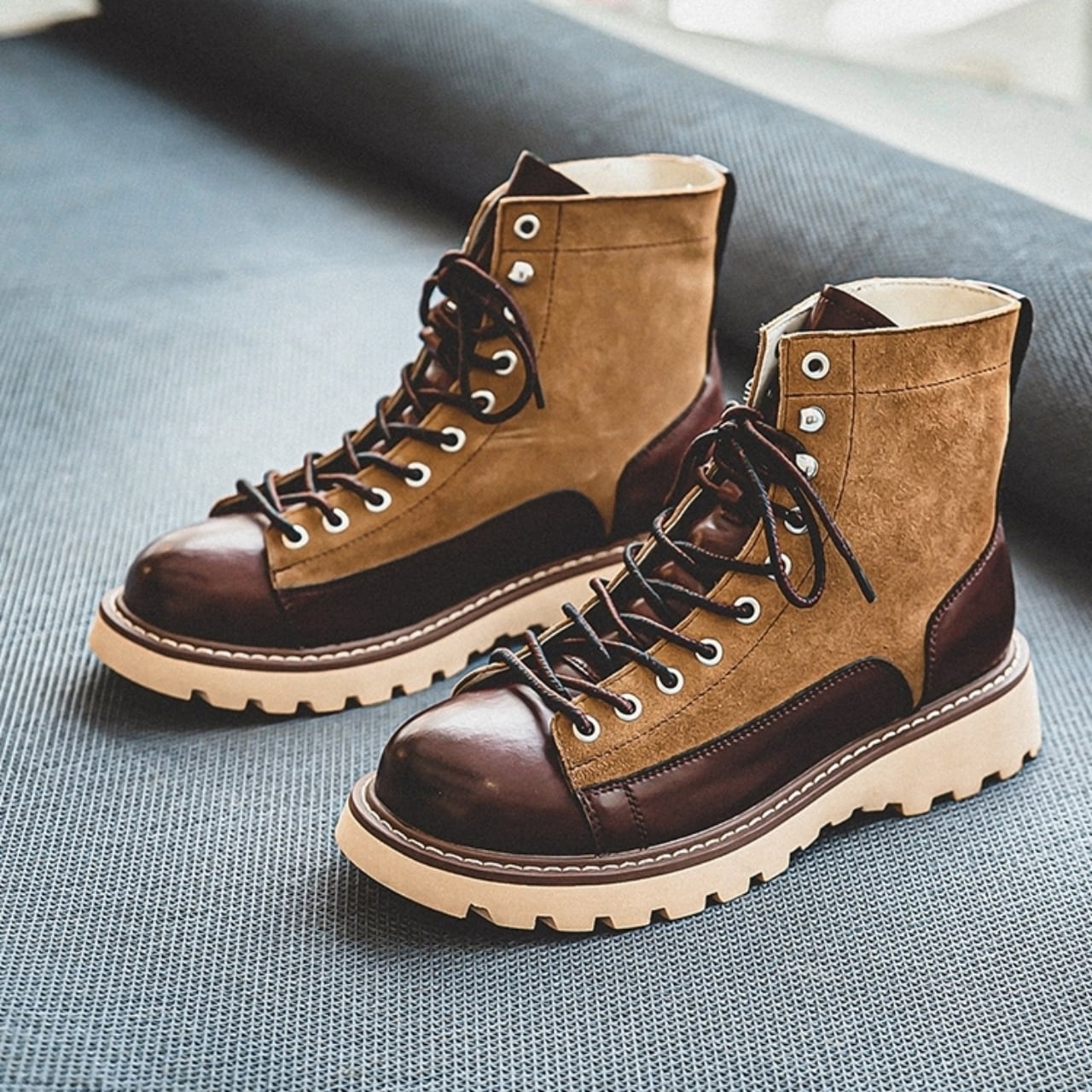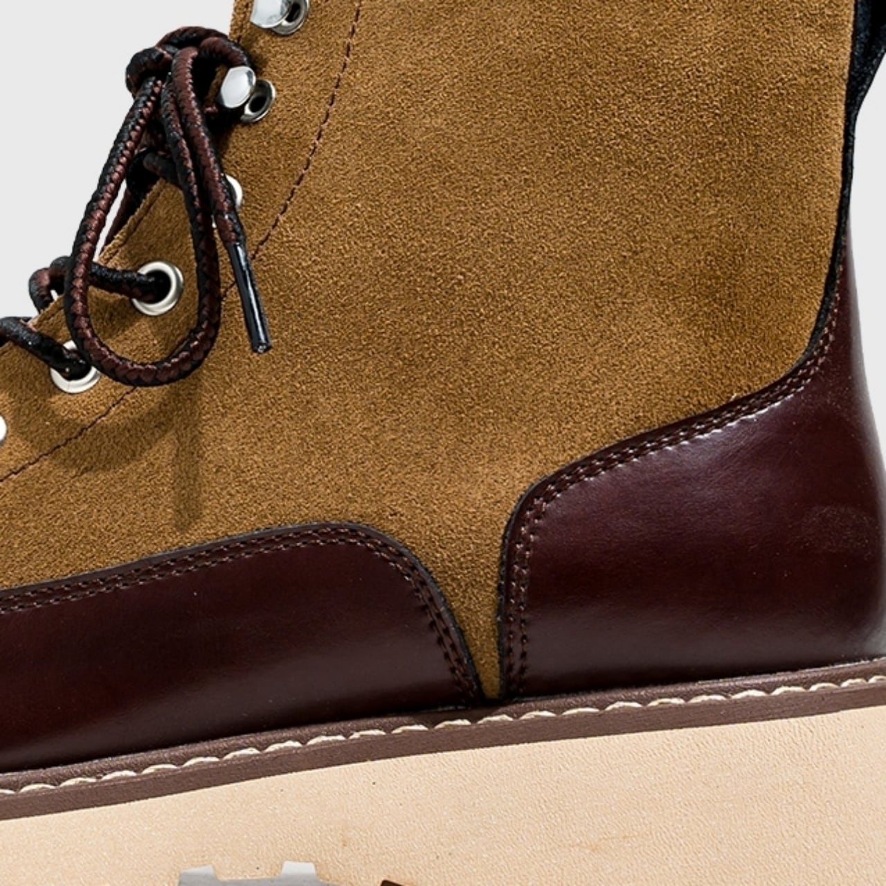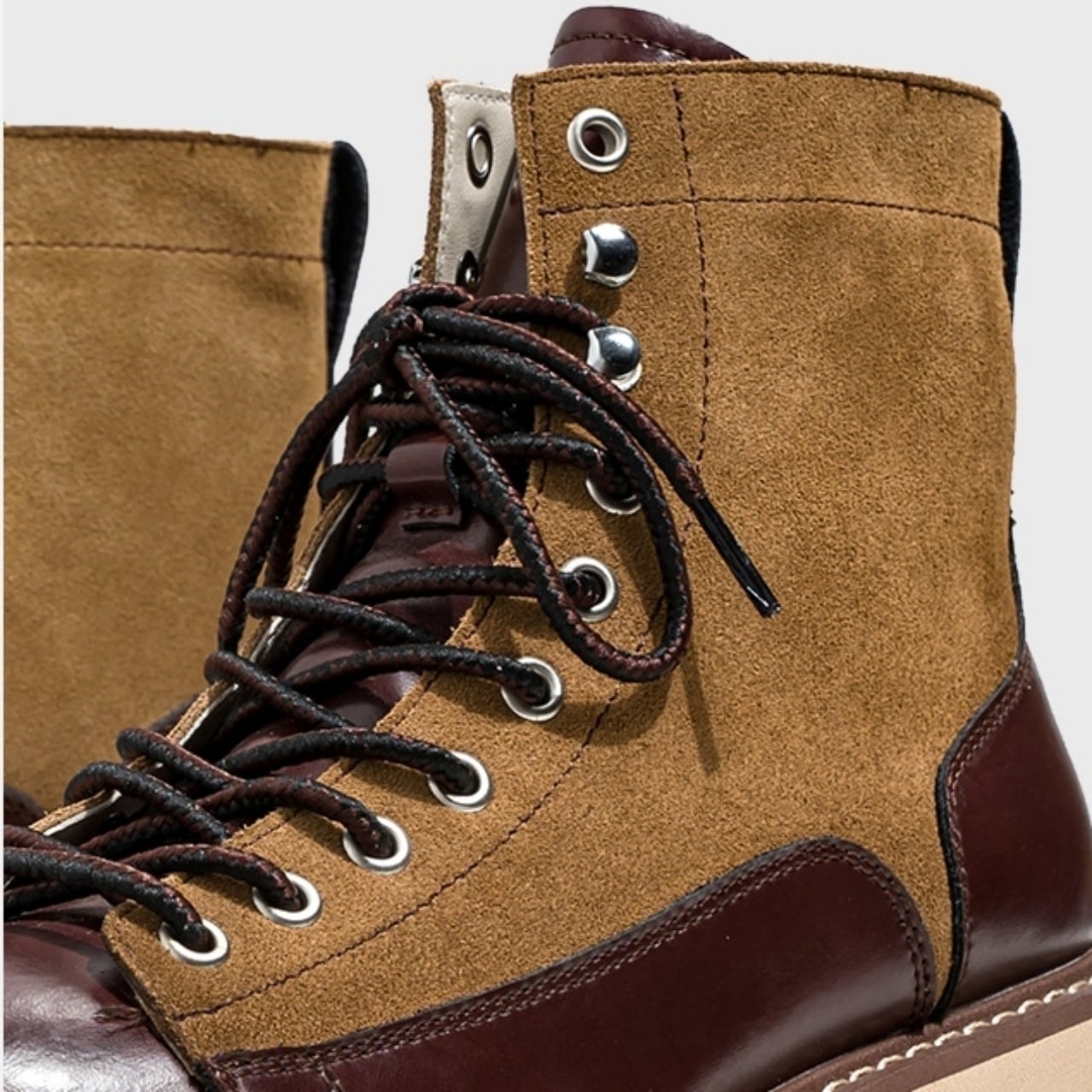 レトロでおしゃれなバイカラーのレザーブーツ。
