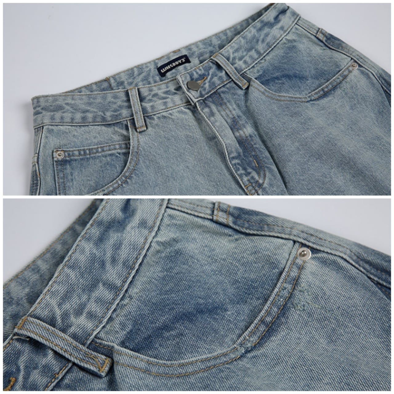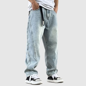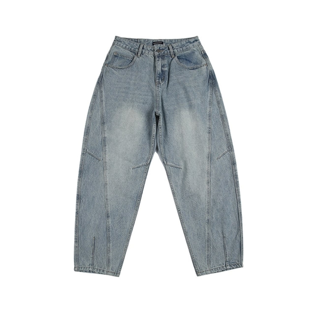 レトロなウォッシュドデニムが特徴のルーズストレートデニムジーンズ。