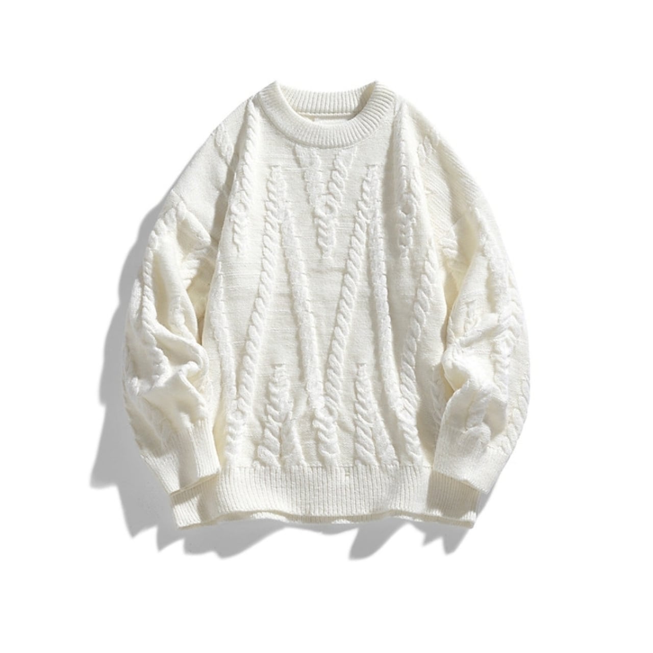 ケーブル編みのデザインが魅力的な、クルーネックのケーブルニットセーター。
