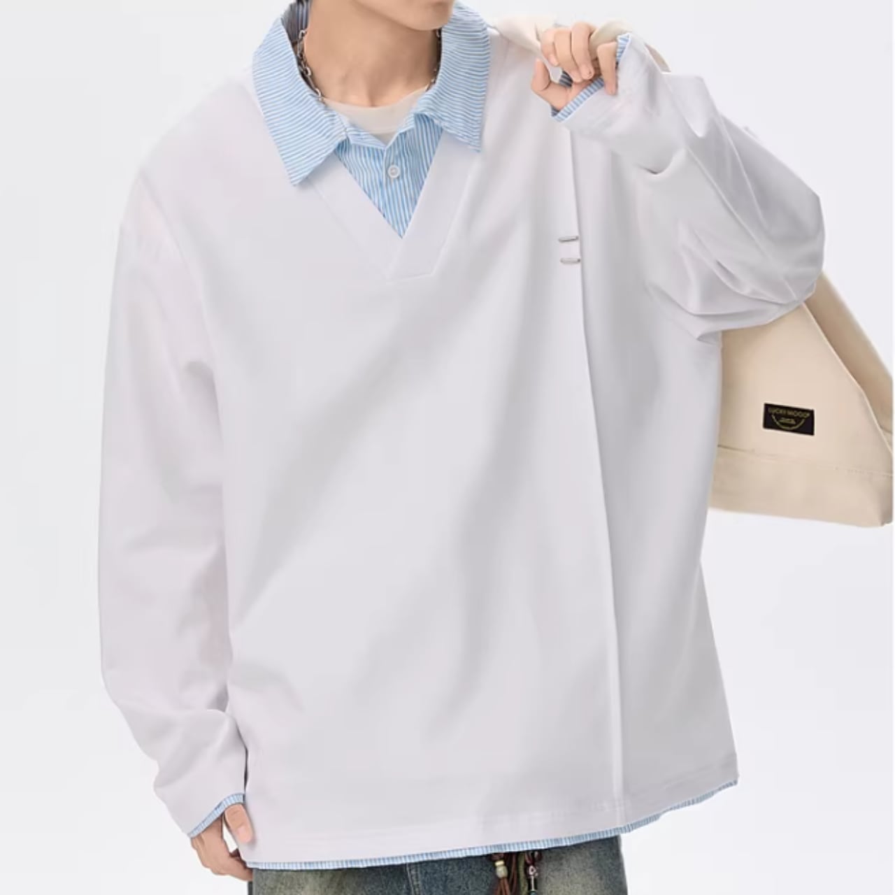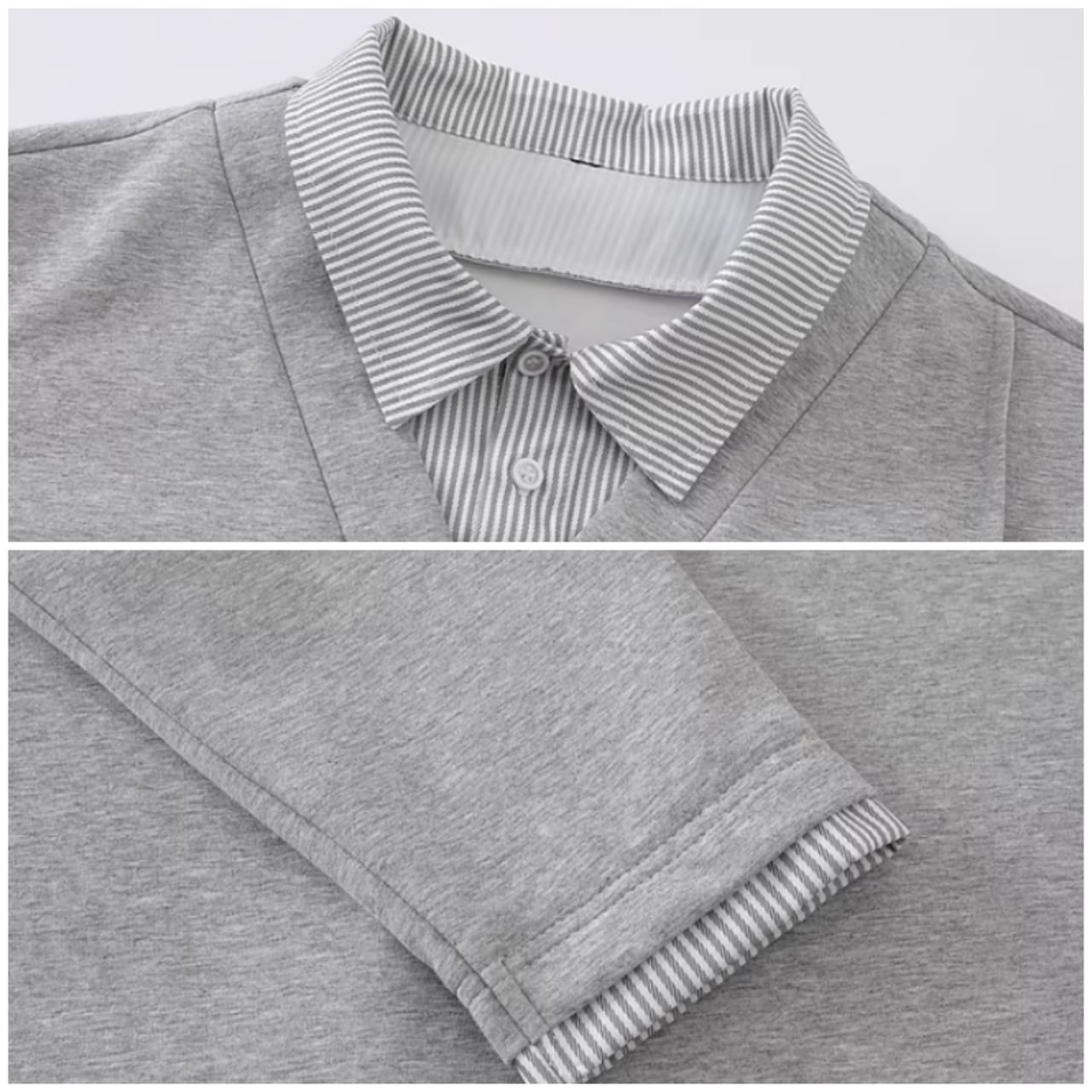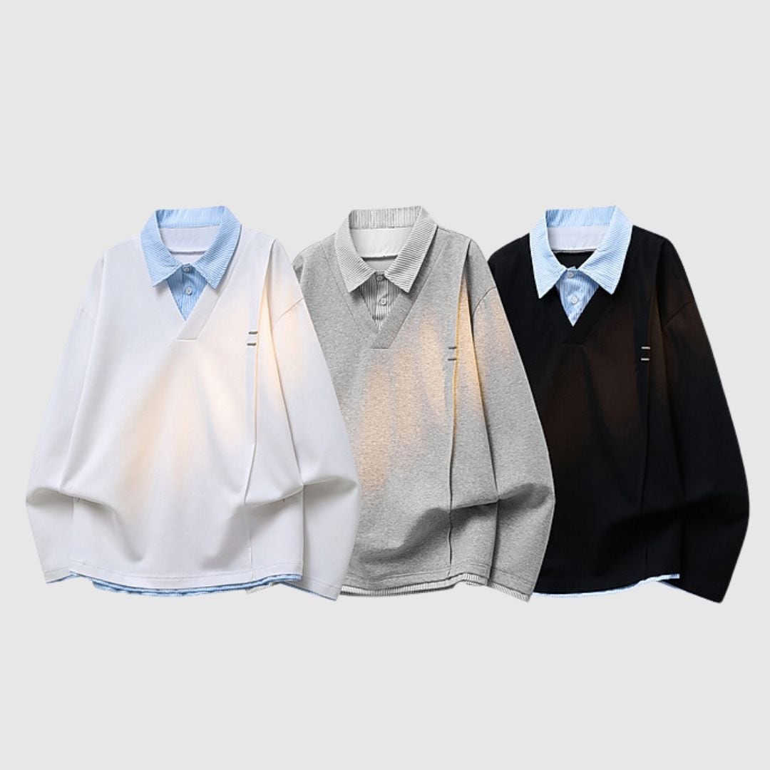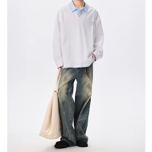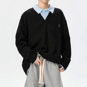 Vネックのスウェットトップスとストライプ柄シャツがドッキングした、フェイクレイヤードスウェットシャツ。