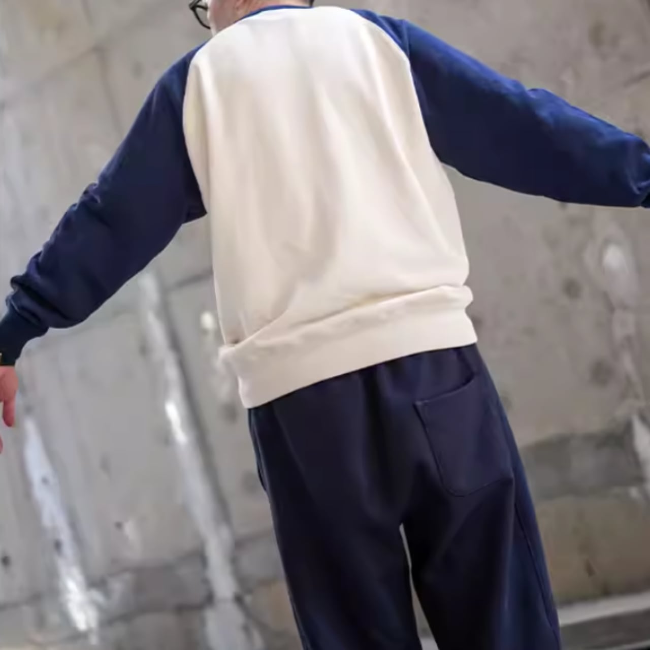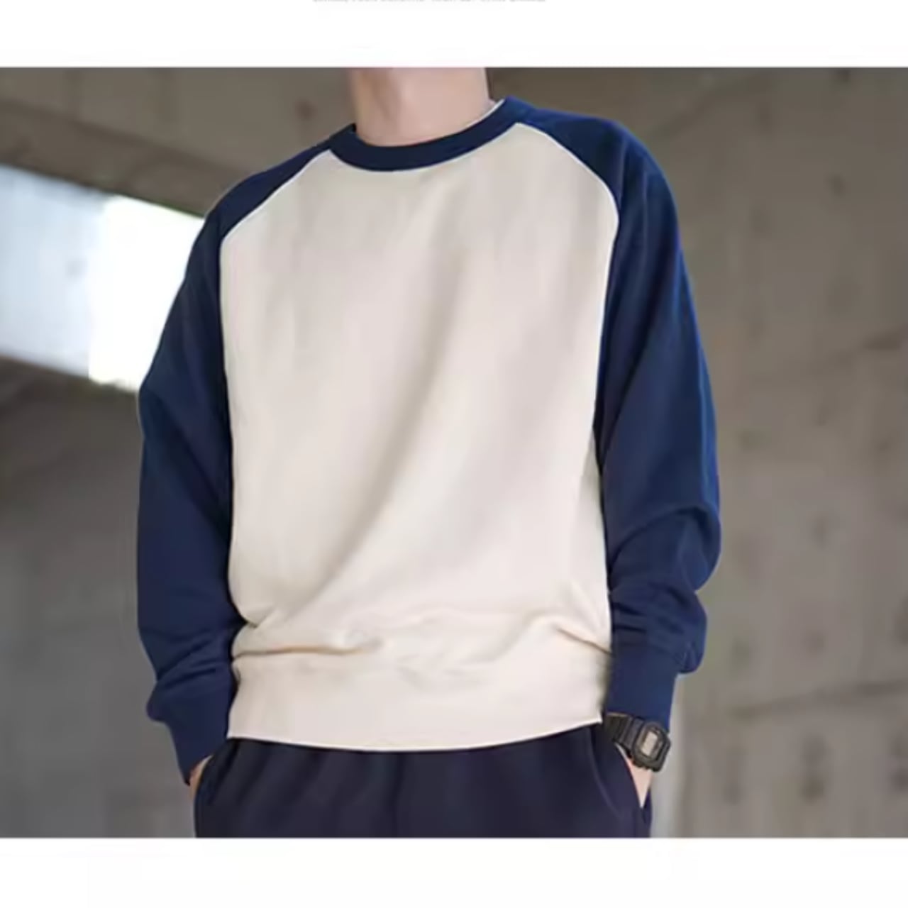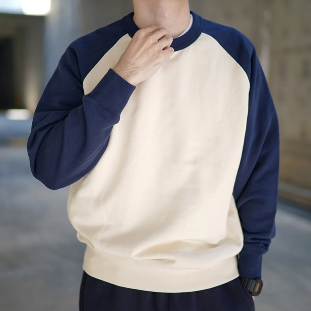 カジュアルコーデにぴったりなバイカラーラグランスウェットシャツ。