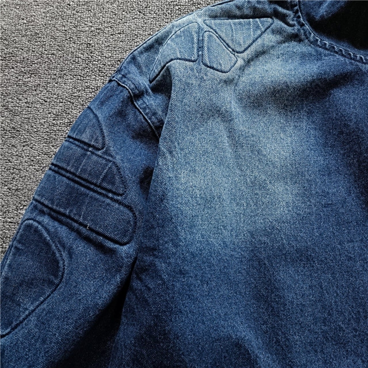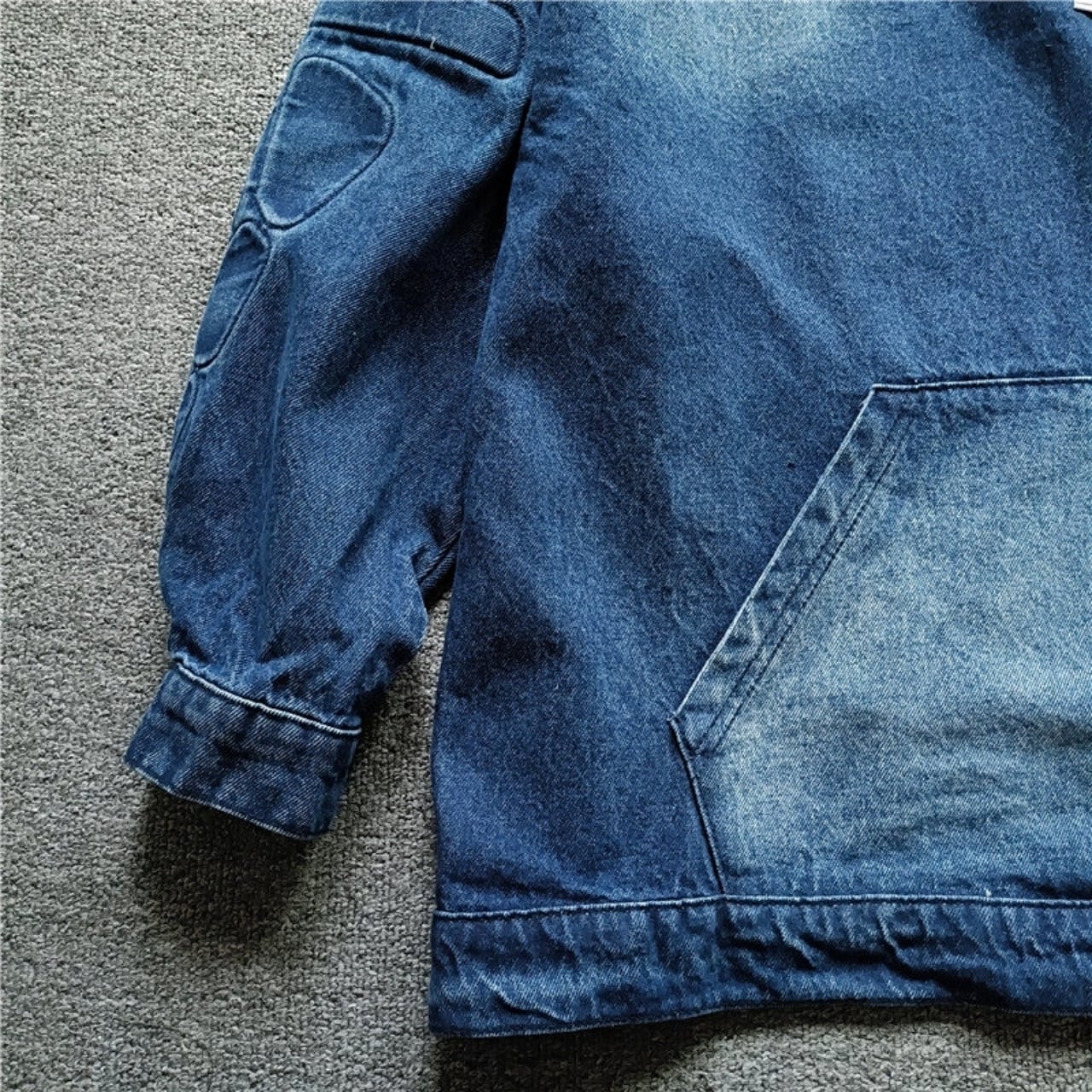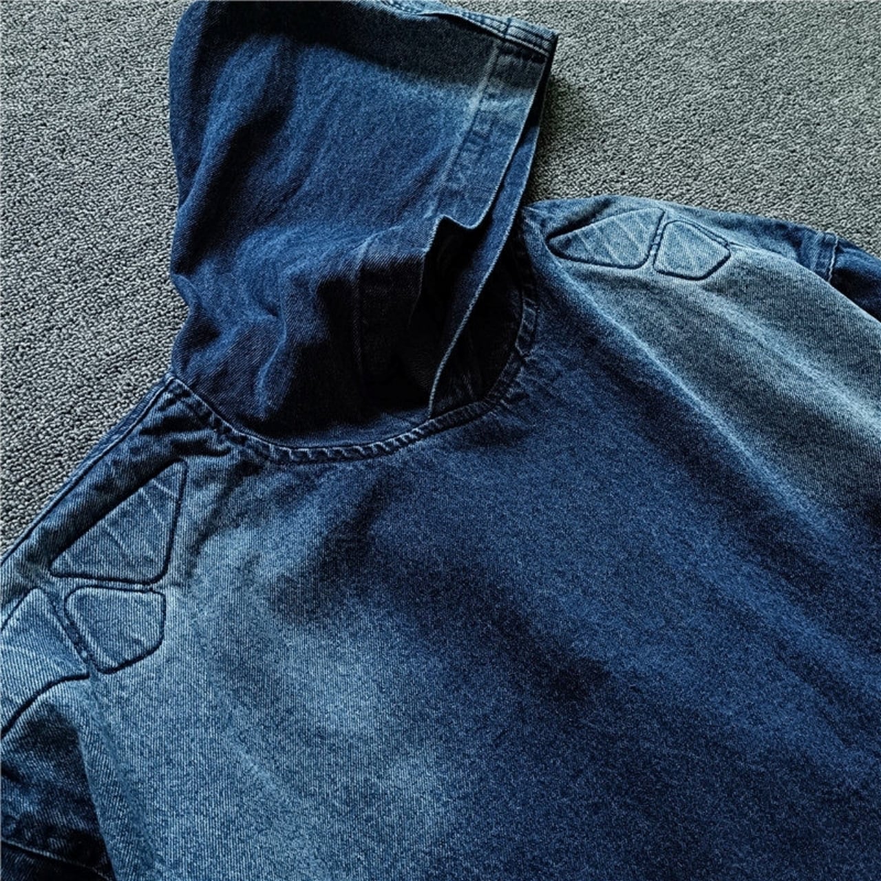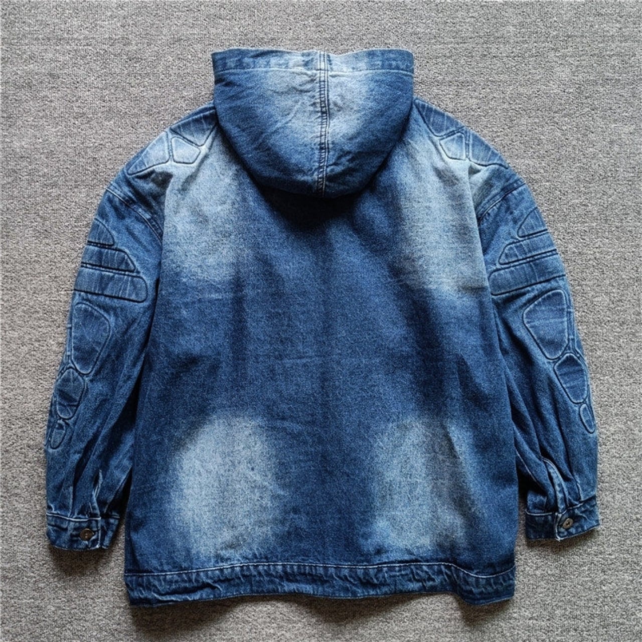 ウォッシュドデニムを使用したプルオーバーデニムジャケット。
