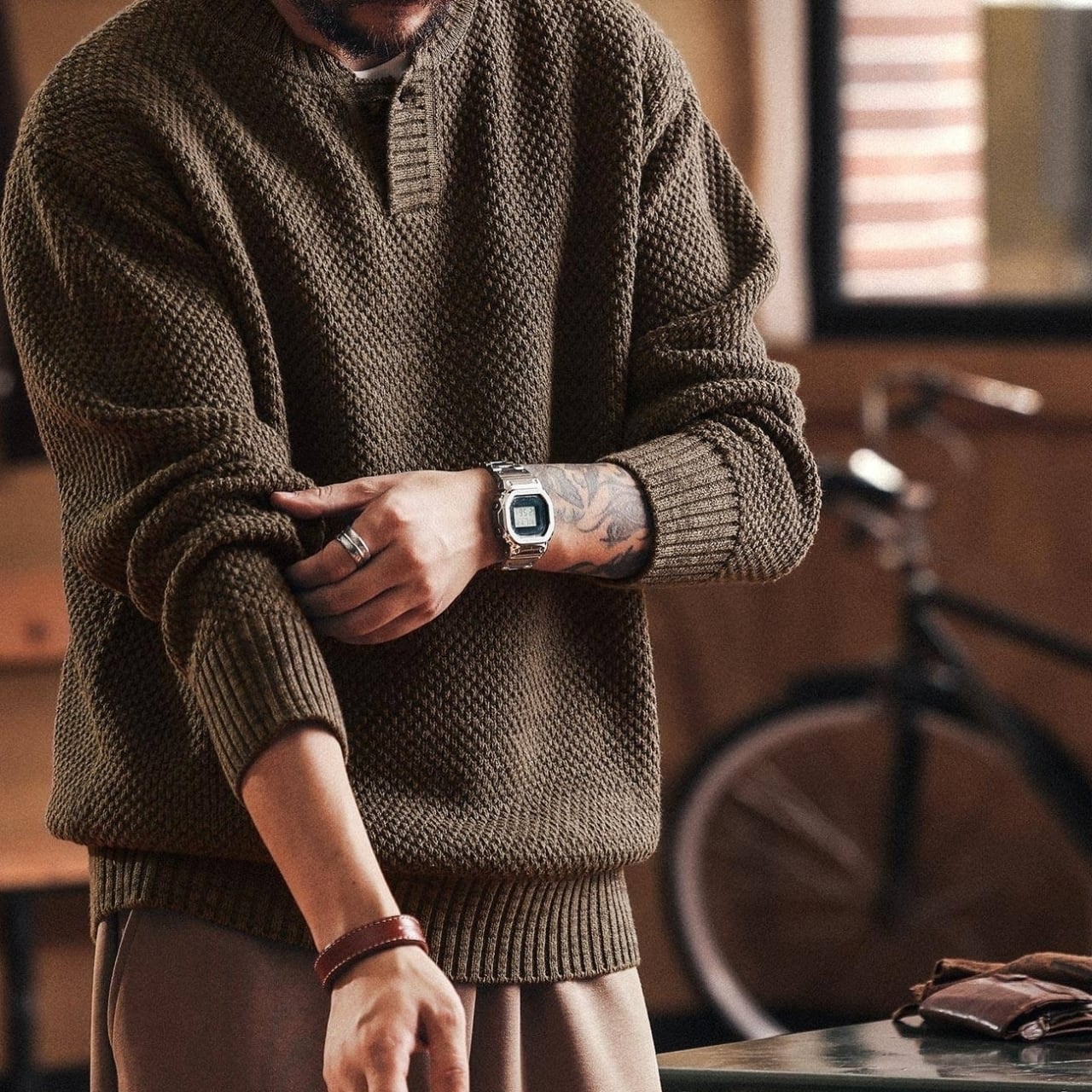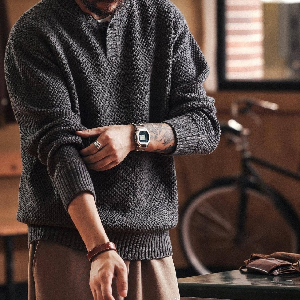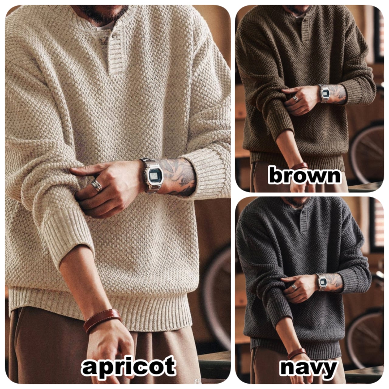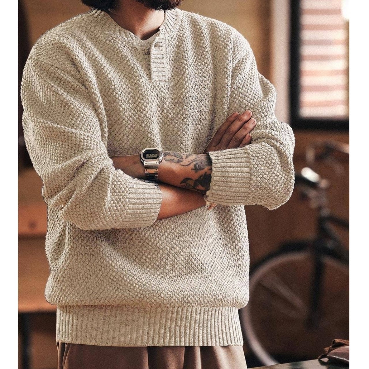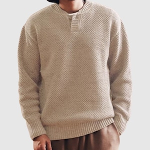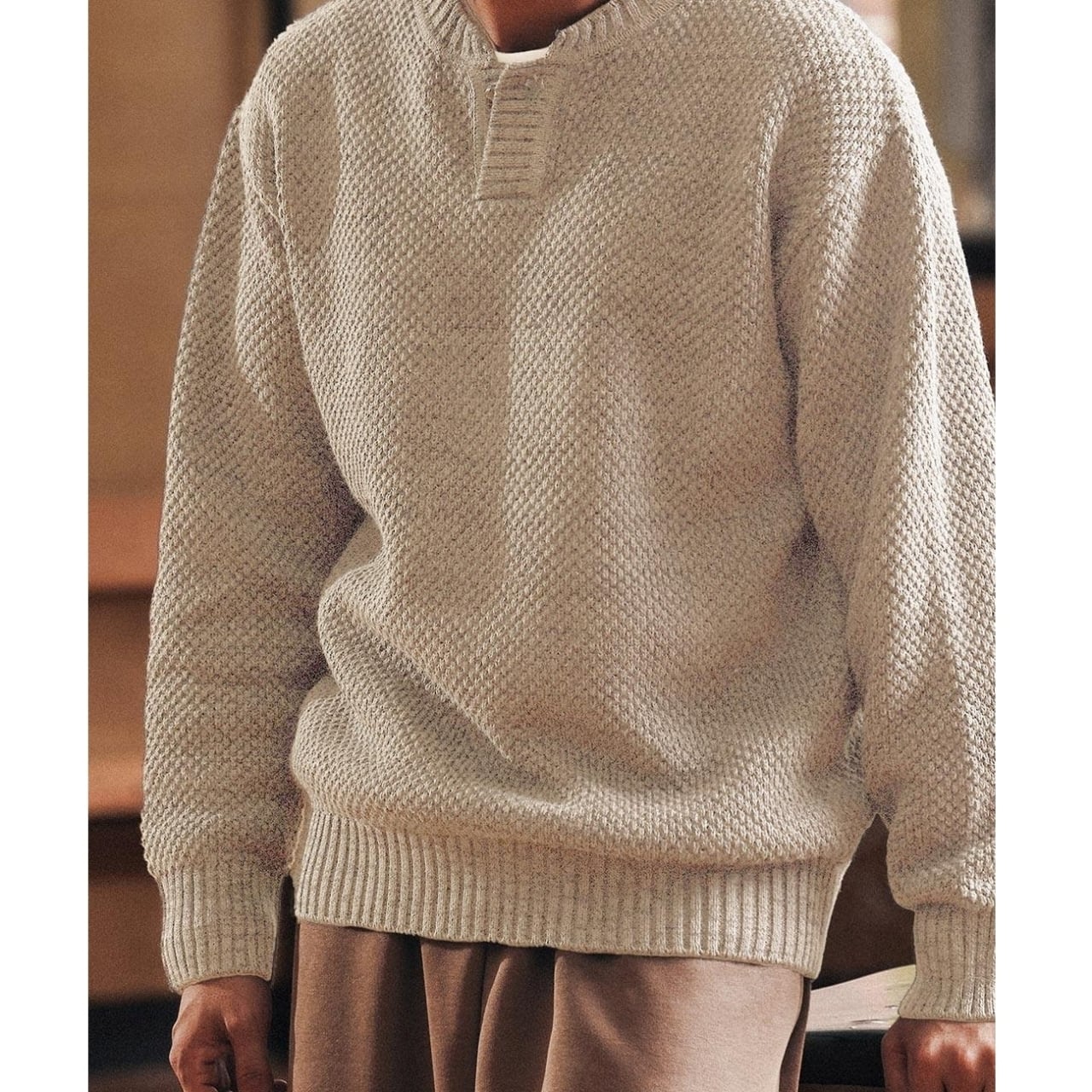 レトロな雰囲気が魅力のヘンリーネックセーター。