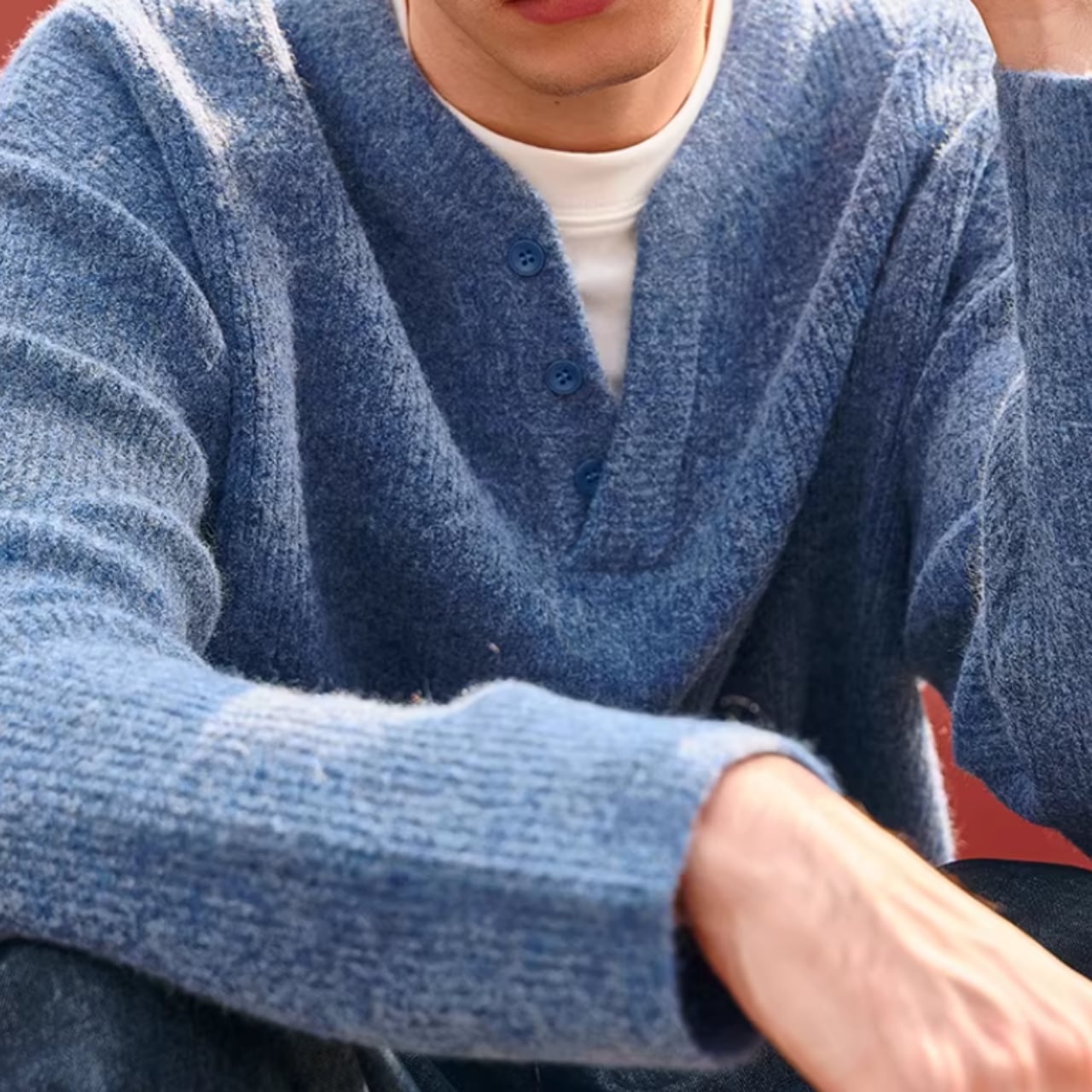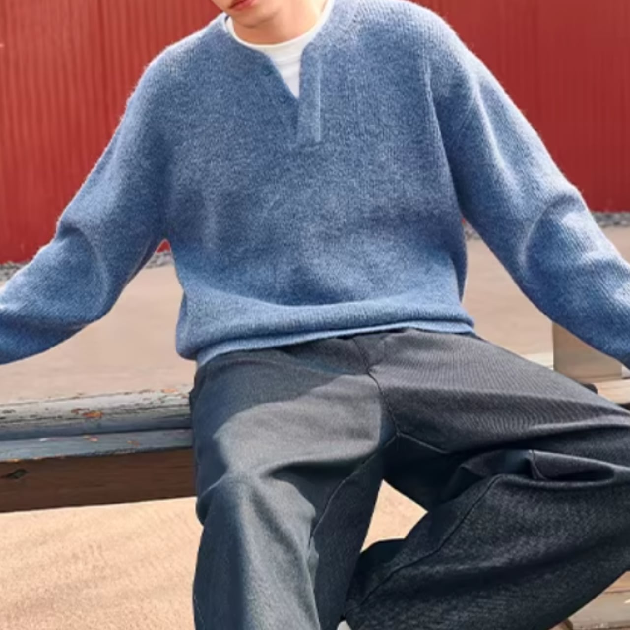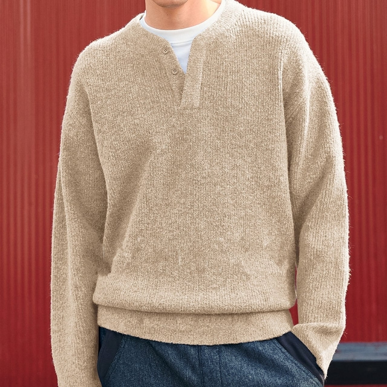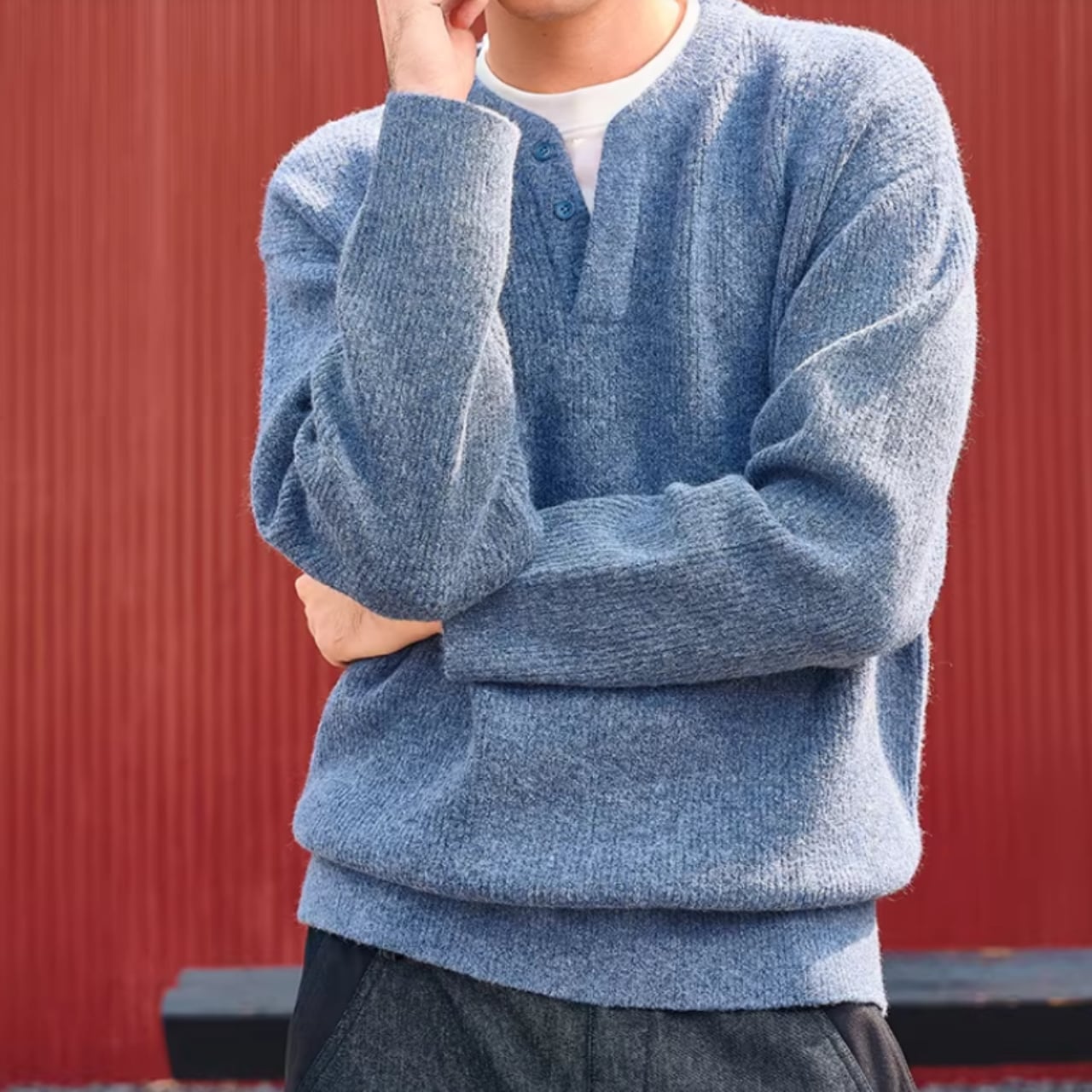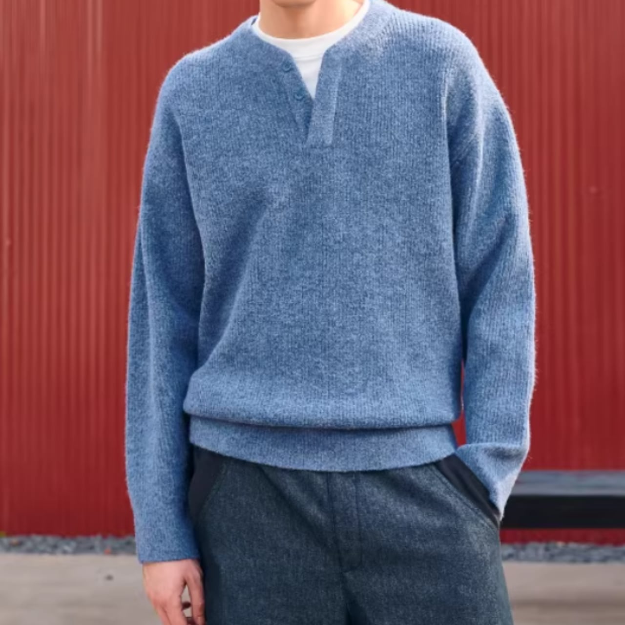 白のインナーが顔を覗かせるヘンリーネックデザインで、おしゃれな印象を与えます♪
