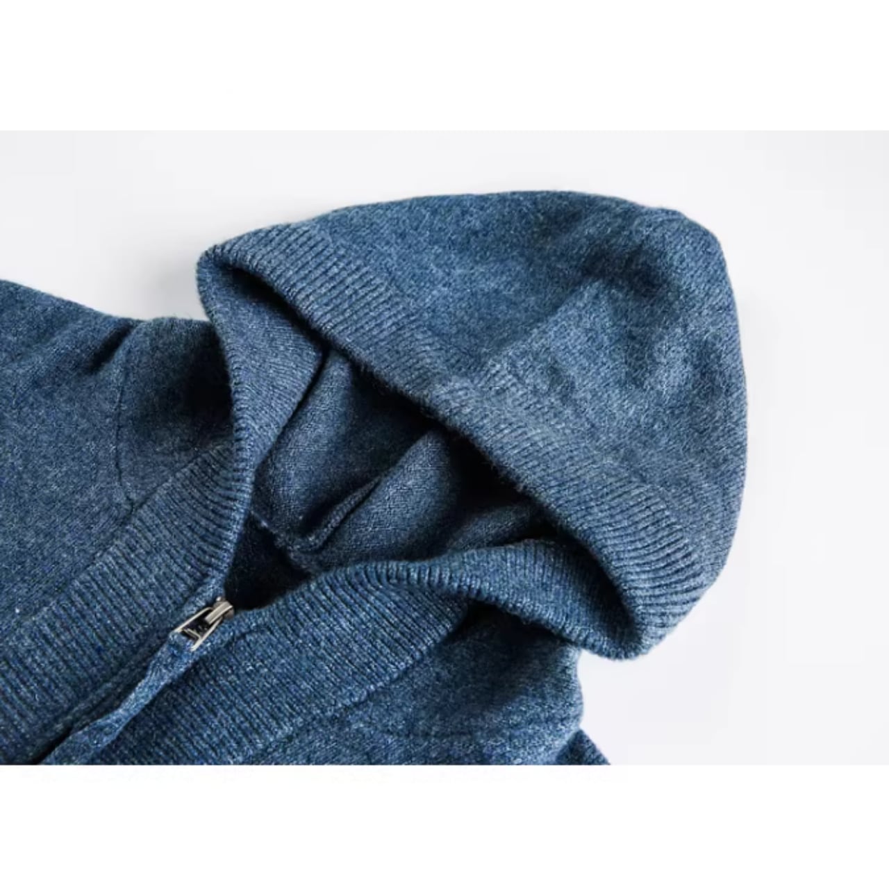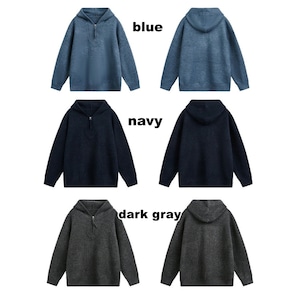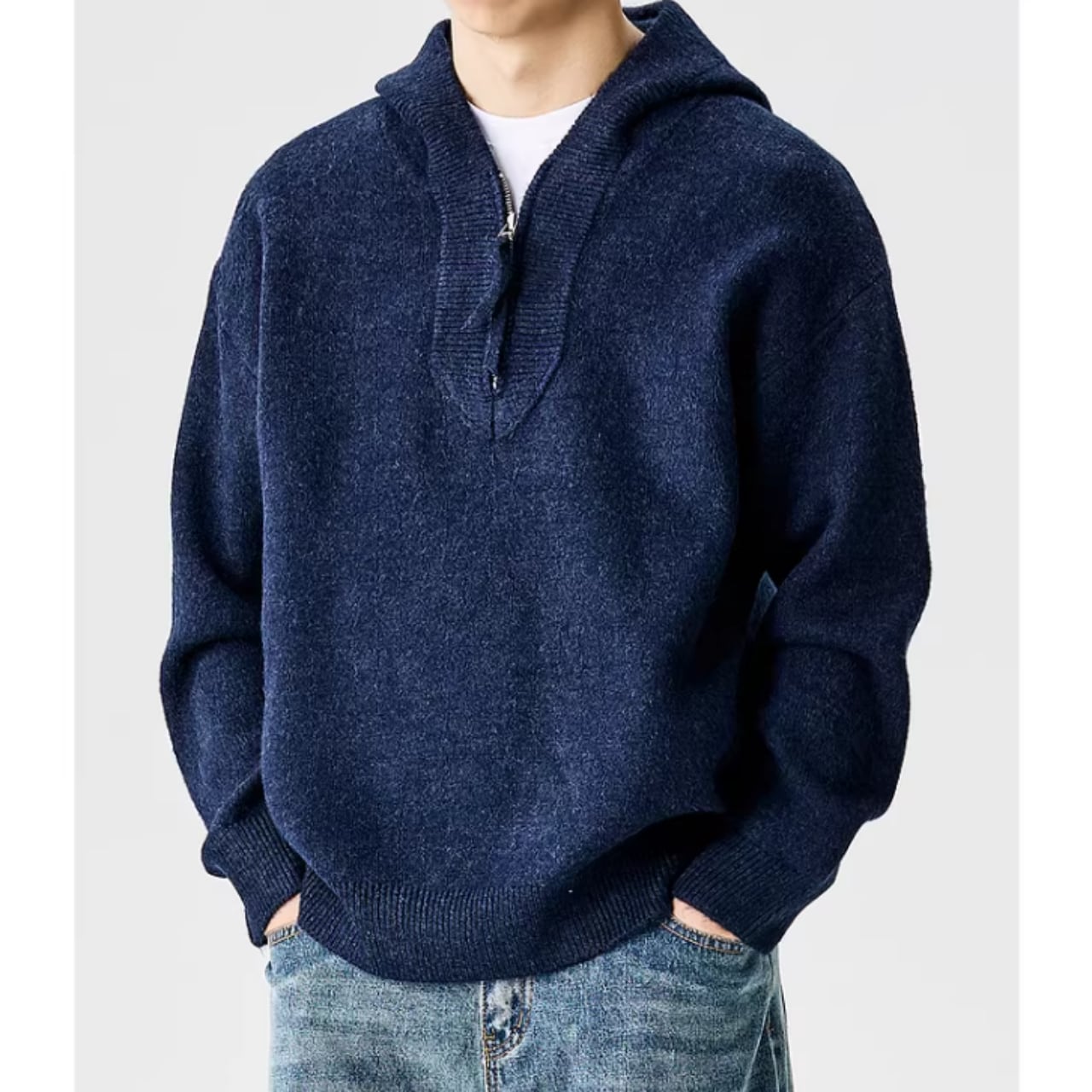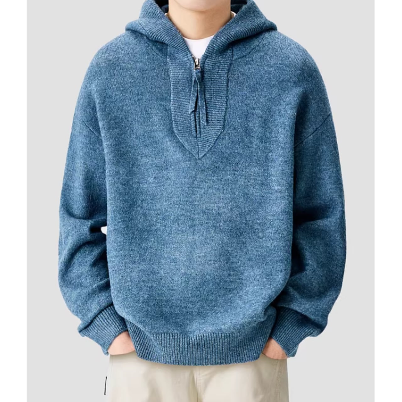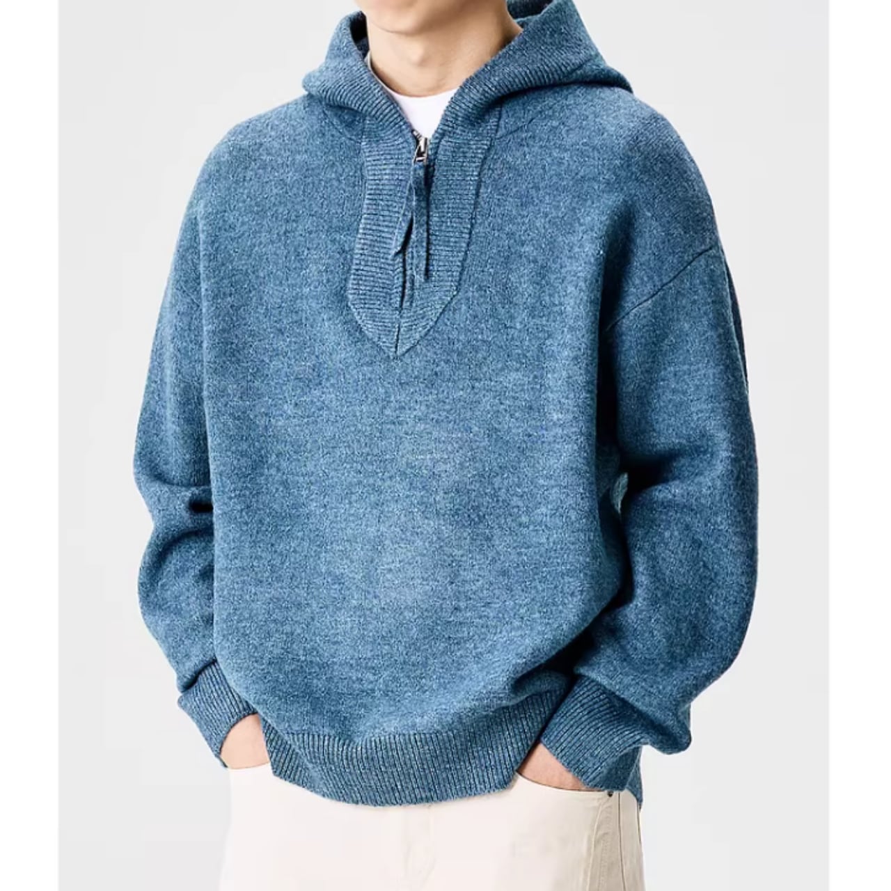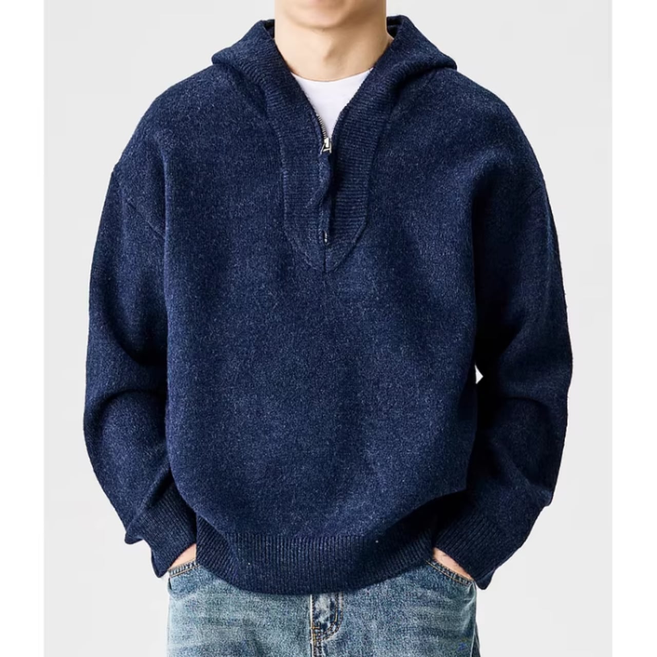 スタイリッシュに仕上げたフード付きハーフジップセーター。
