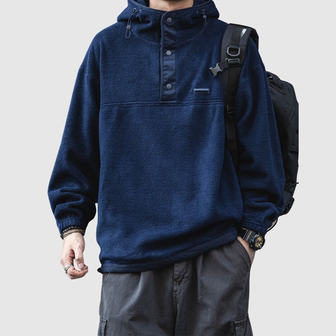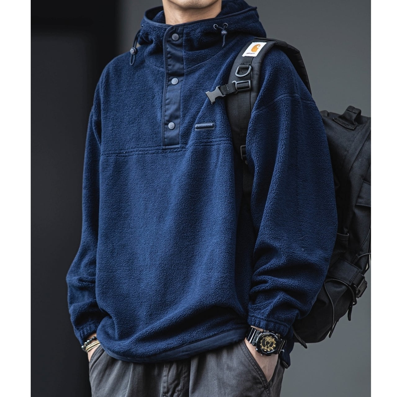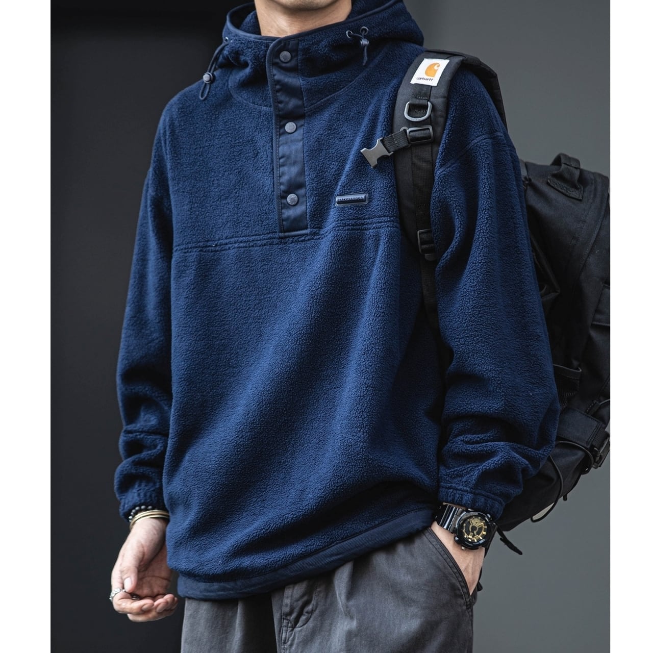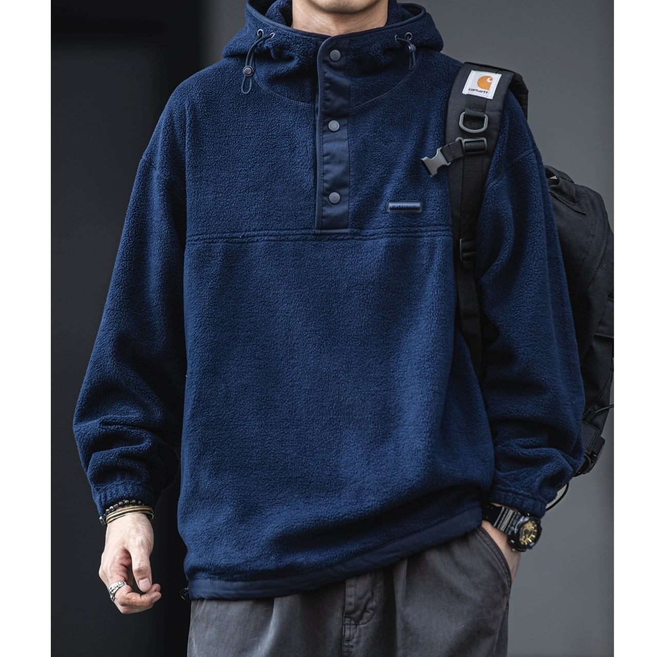 肌触りの良いフリース素材を使用したフード付きフリーストップス。