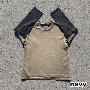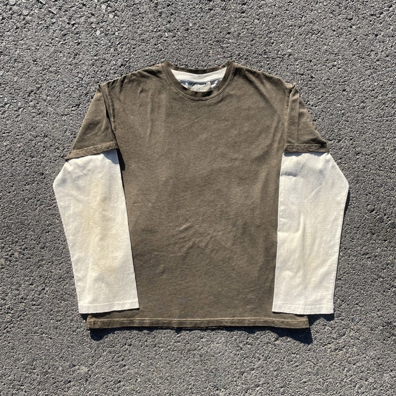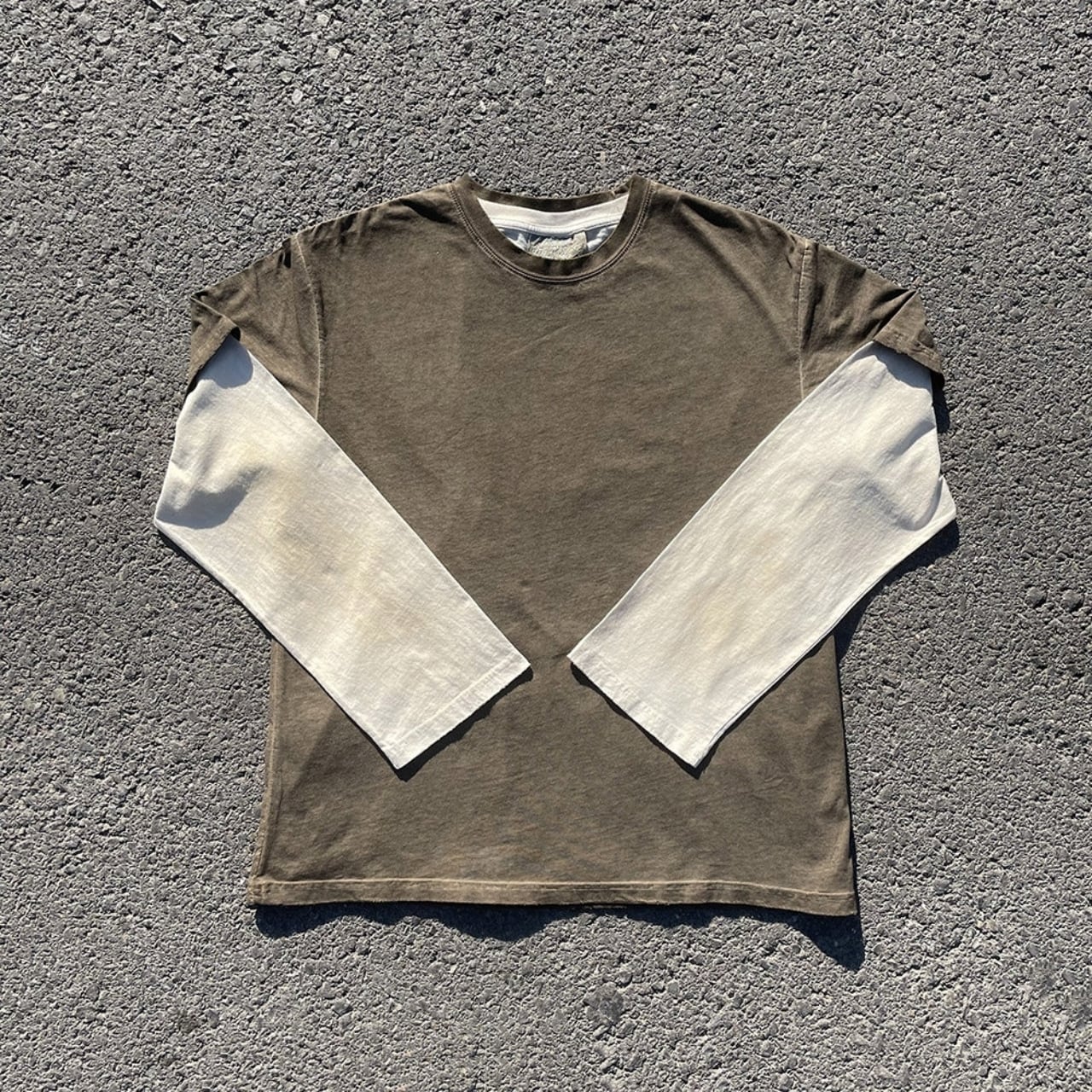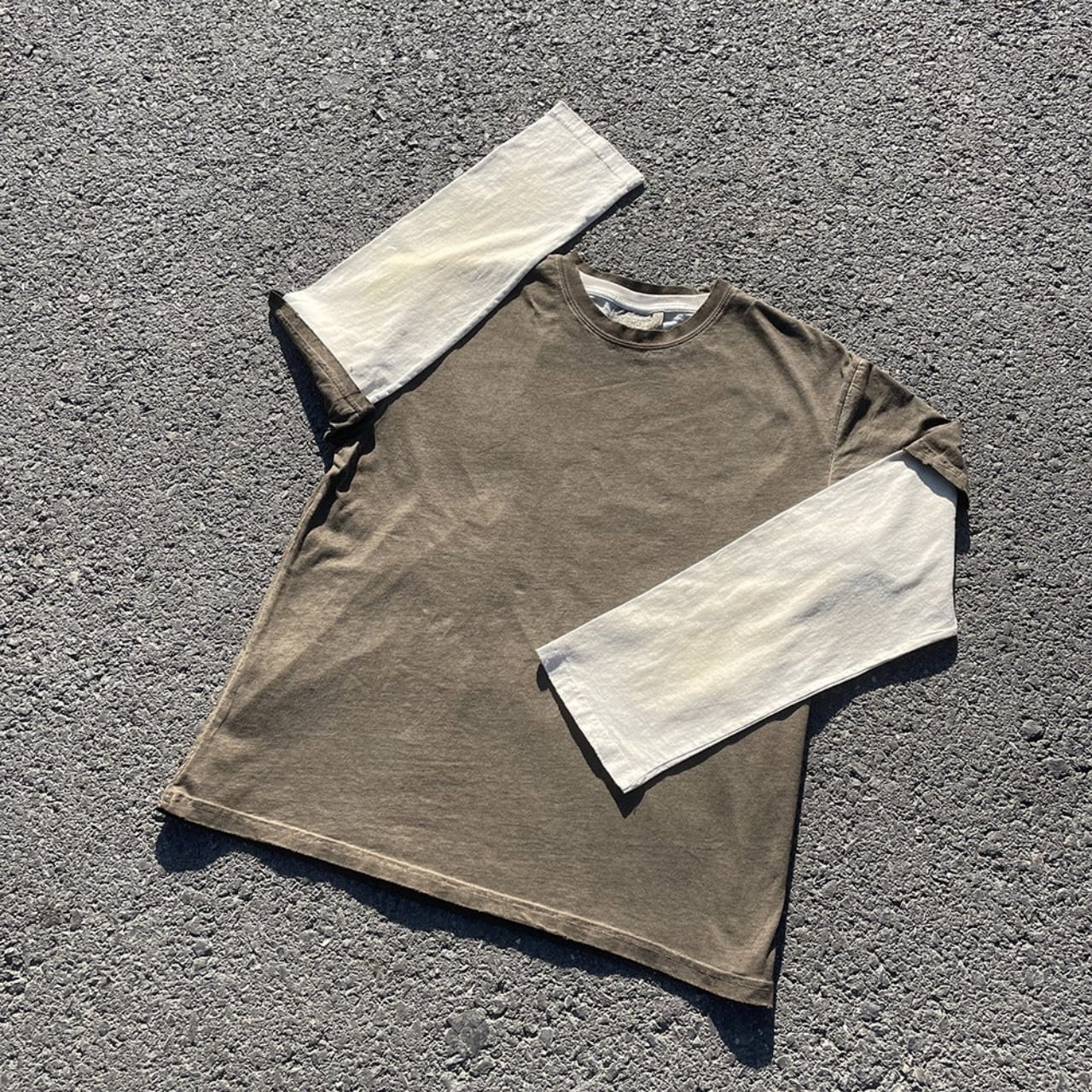 重ね着風のデザインが特徴的なレイヤードスタイルトップス。