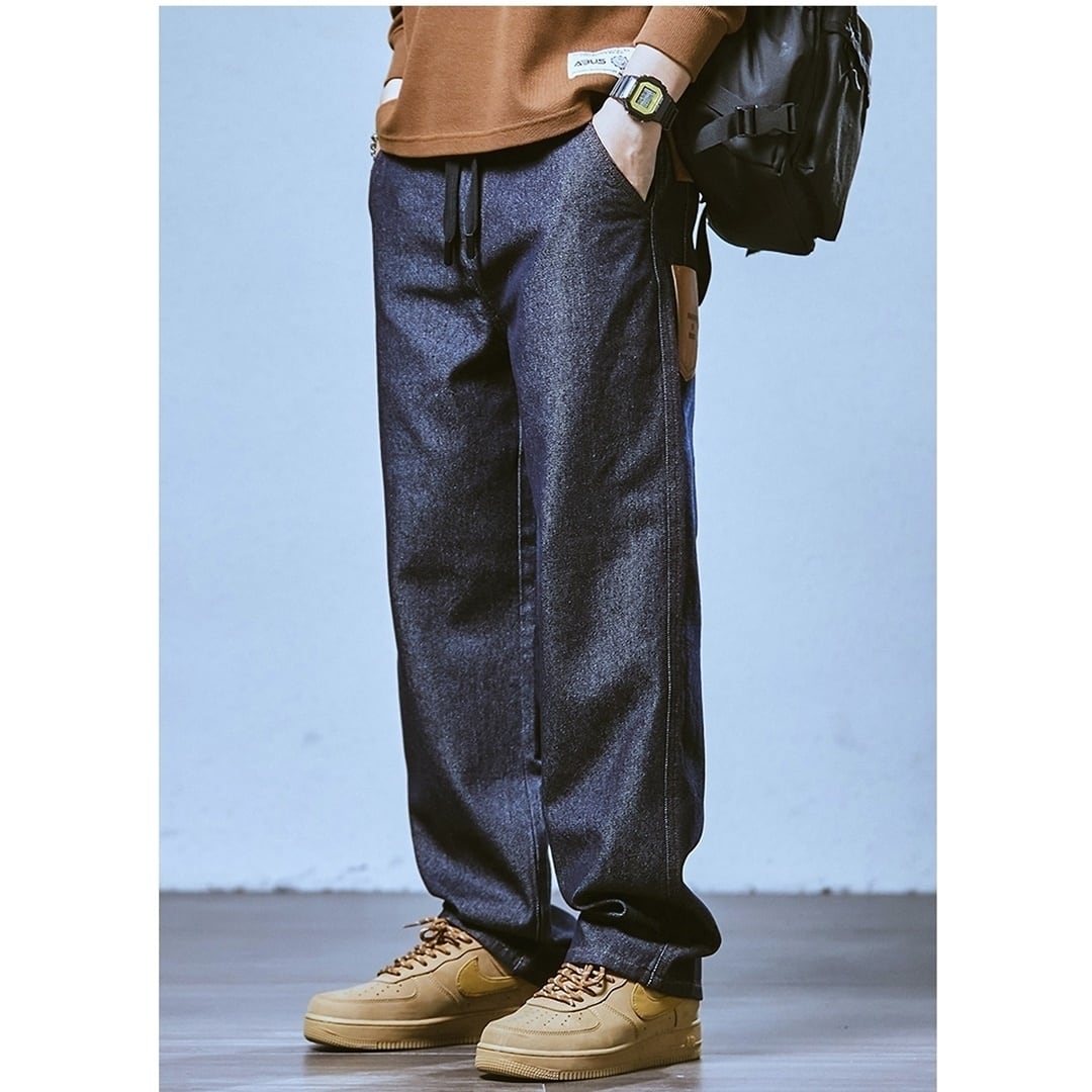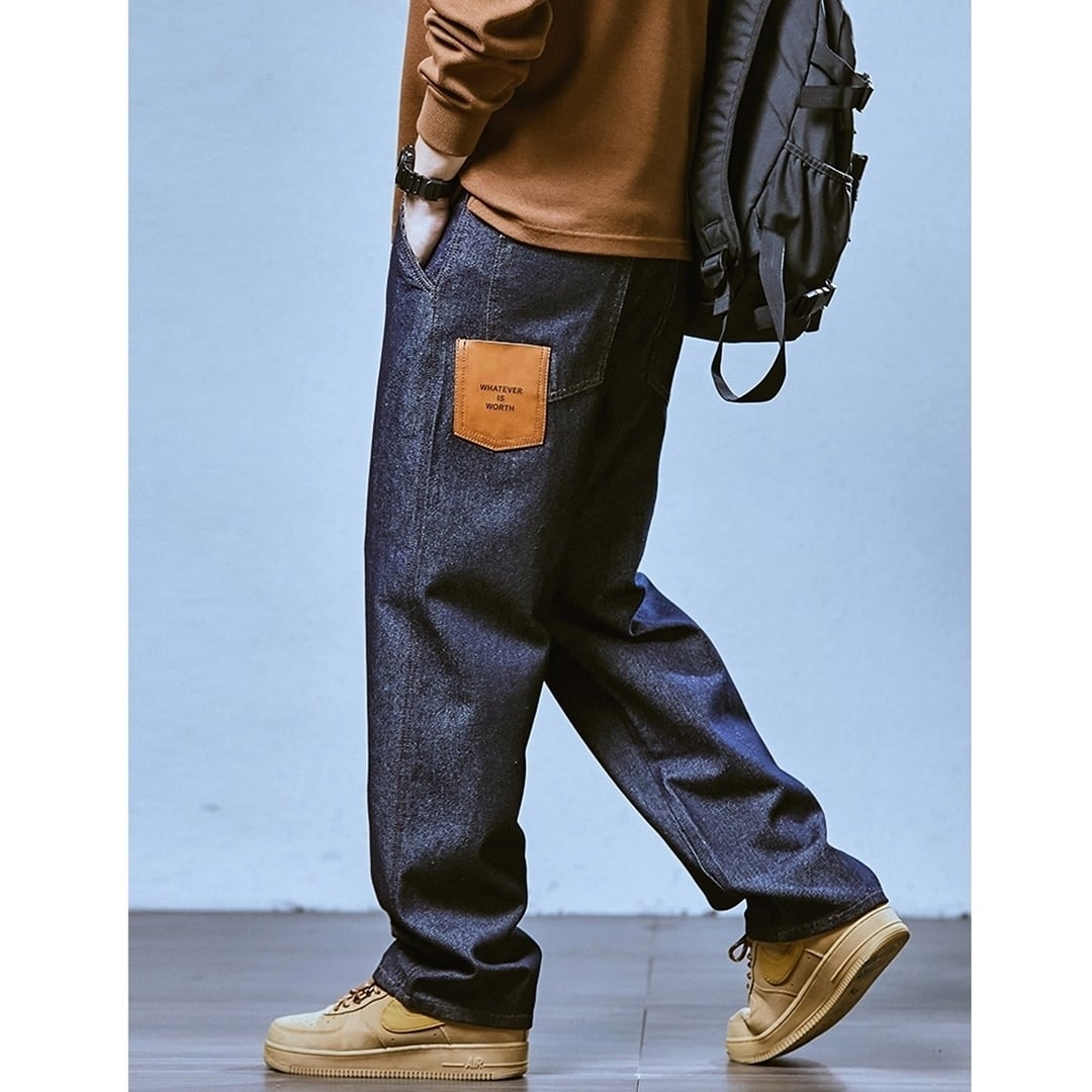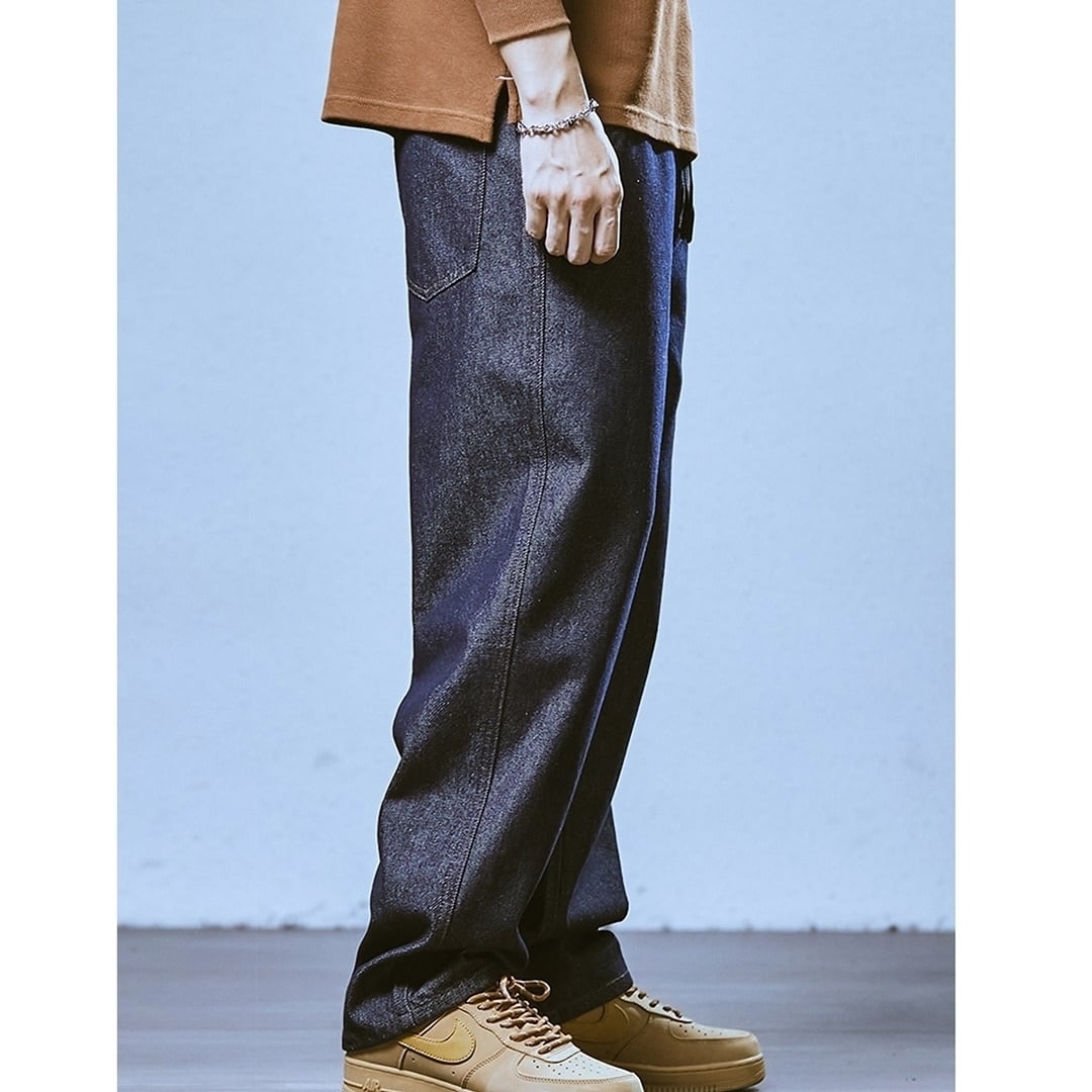 深みのあるダークブルーカラーが印象的なストレートデニムジーンズ。
