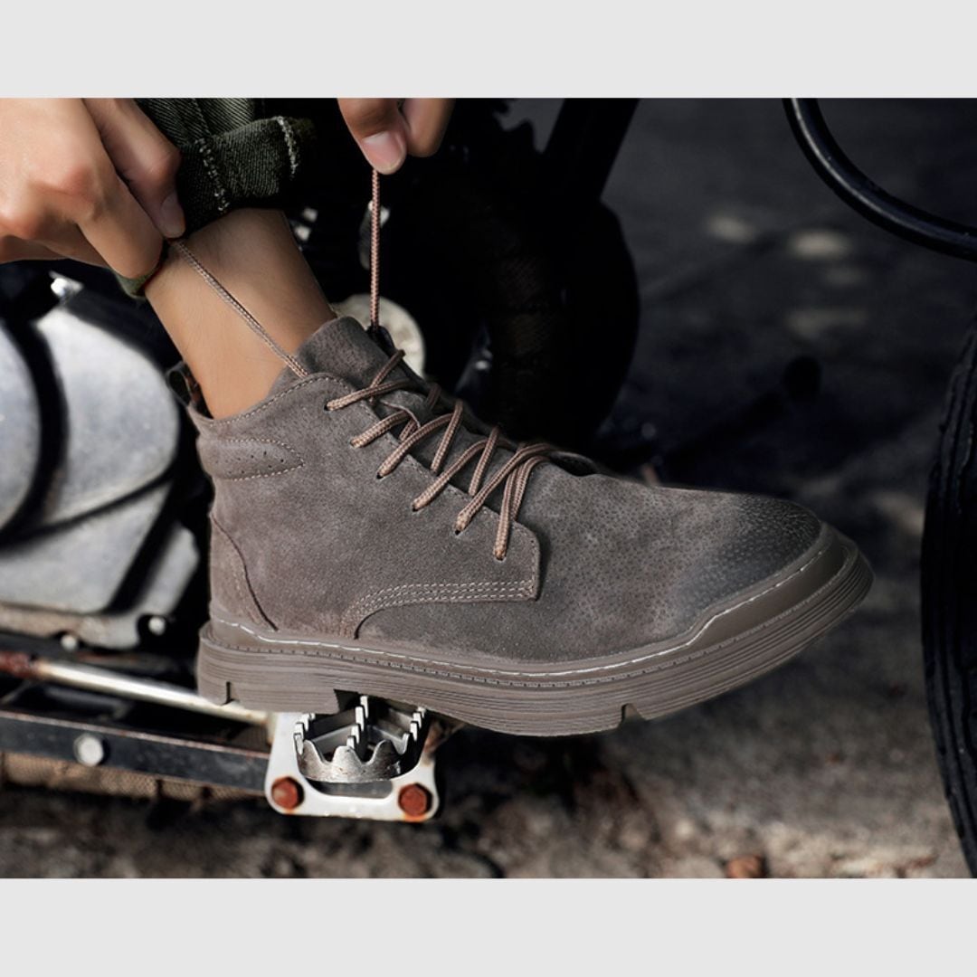 ヴィンテージ風のレザー素材とアッパーサイドのレースアップが、クラシックとモダンな融合を生み出しています。